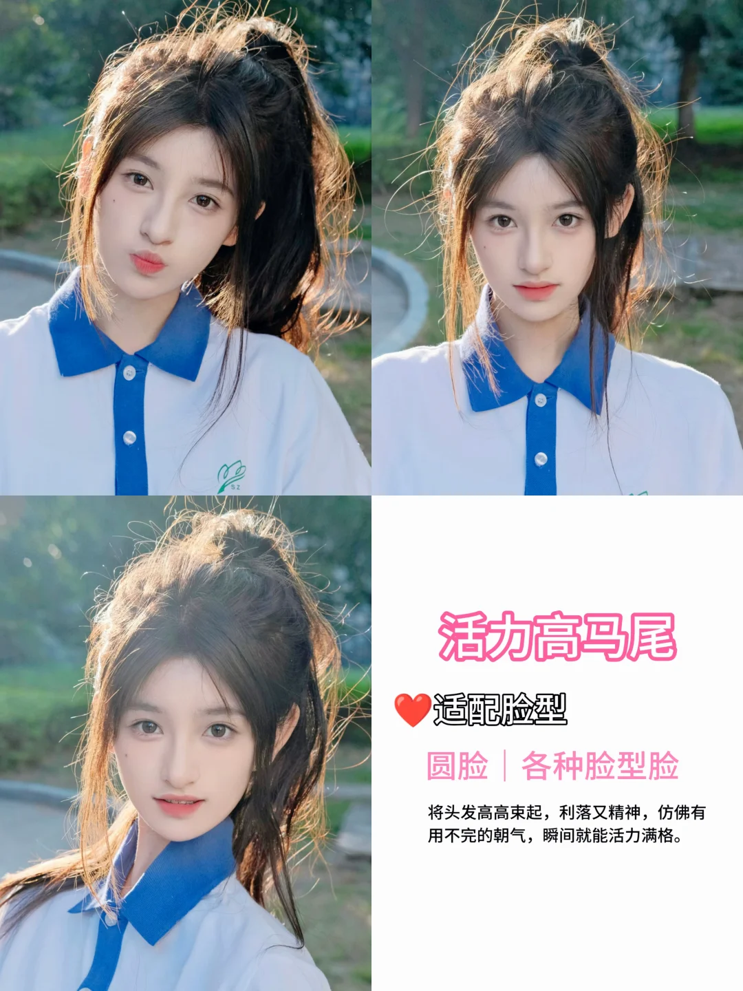 2. 活力高马尾✨头发高高束起,利落又有朝气,瞬间活力满格~各种脸型都适配,还能拉长脸部比例;额头过窄的宝子可留些刘海修饰,不然会显额头更窄。