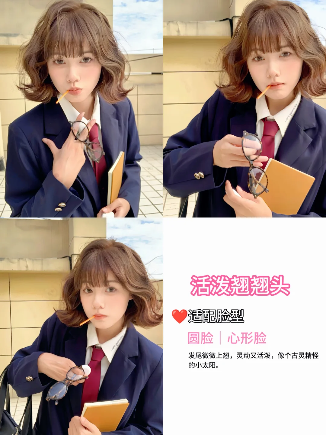7. 活泼翘翘头🍂发尾微微上翘,灵动又活泼,像古灵精怪的小太阳~适配圆脸、心形脸,能为造型增添活泼感;长脸避雷,容易显脸长。