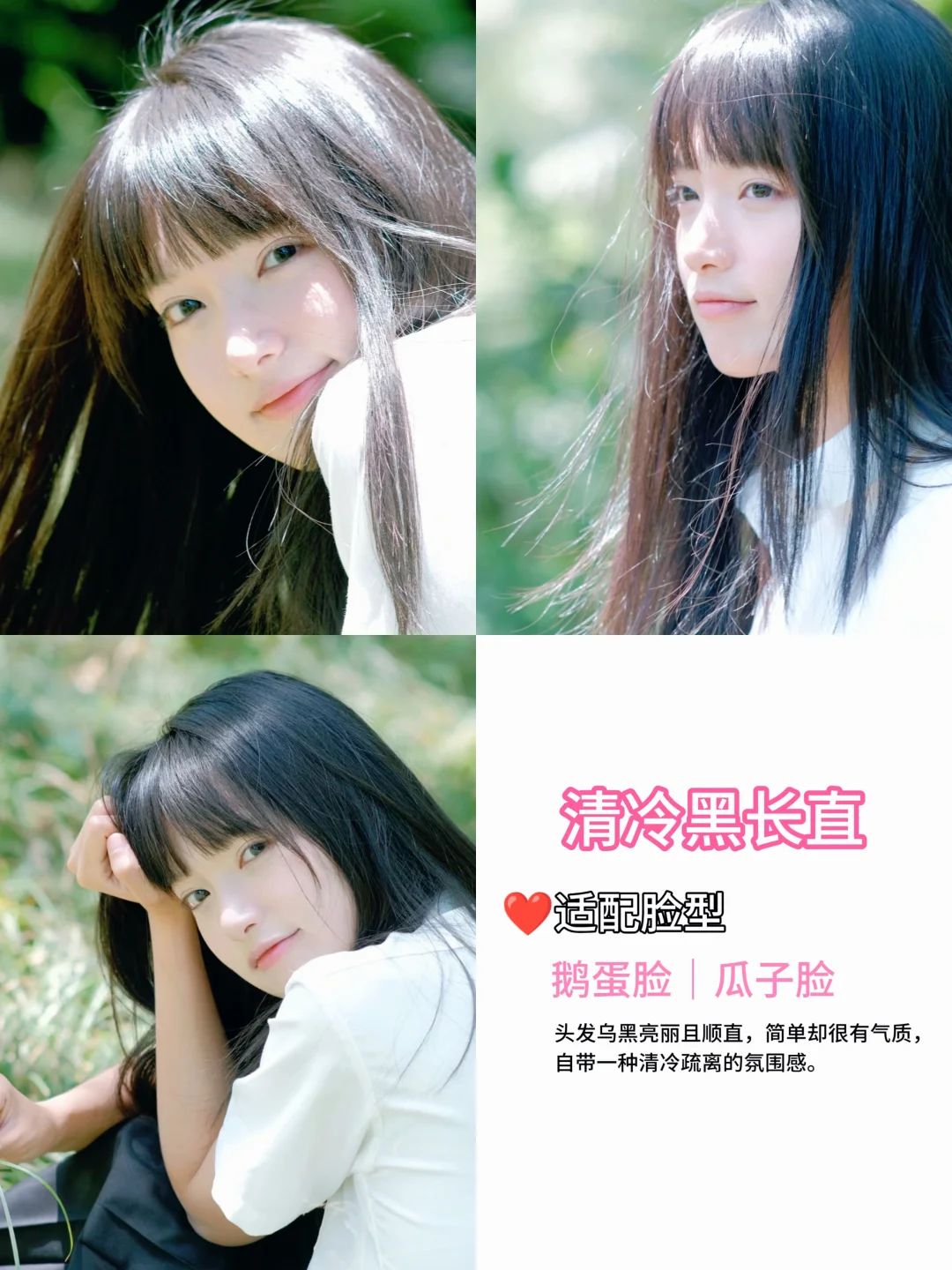 5. 清冷黑长直😍头发乌黑顺直,简单却有气质,自带清冷疏离感~适配鹅蛋脸、瓜子脸,能突出脸部精致感;方脸避雷,会显脸部线条更硬朗。