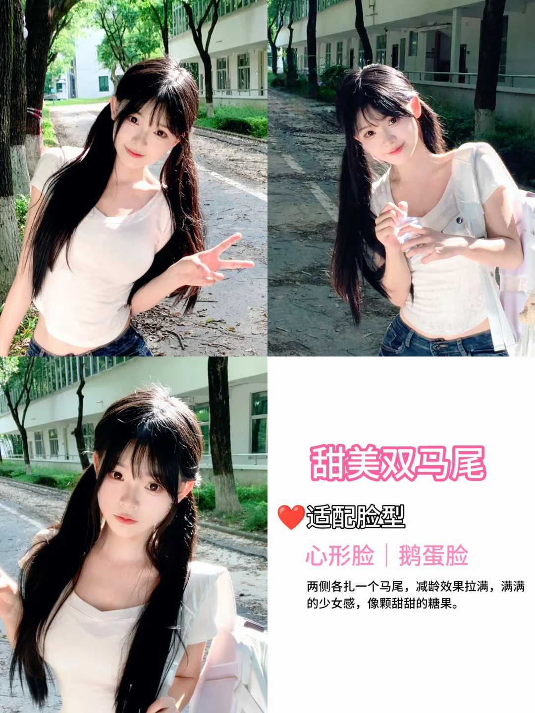 3. 甜美双马尾😊两侧各扎一个马尾,减龄又少女,像颗甜甜的糖果~适配心形脸、鹅蛋脸,能凸显可爱俏皮感;方脸避雷,会放大脸部硬朗感。