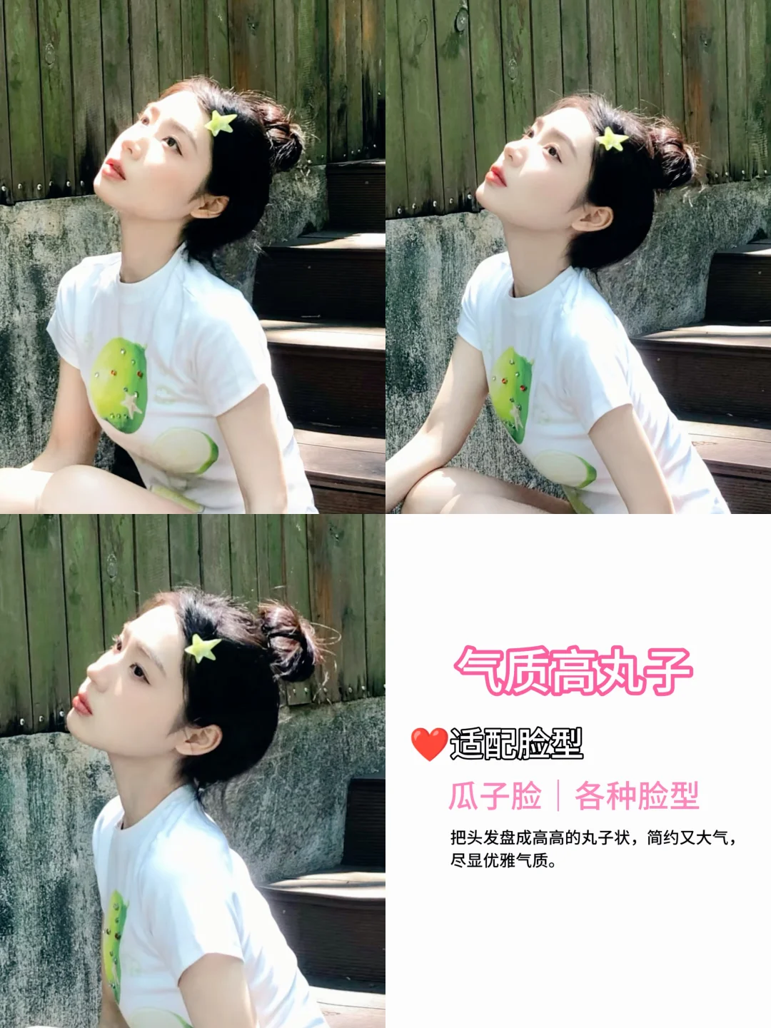 8. 气质高丸子🍃头发盘成高高的丸子状,简约大气,尽显优雅~各种脸型都适配,还能露出修长脖颈线条;下颌线宽的宝子可搭配碎发修饰,不然会让下颌线更显眼。