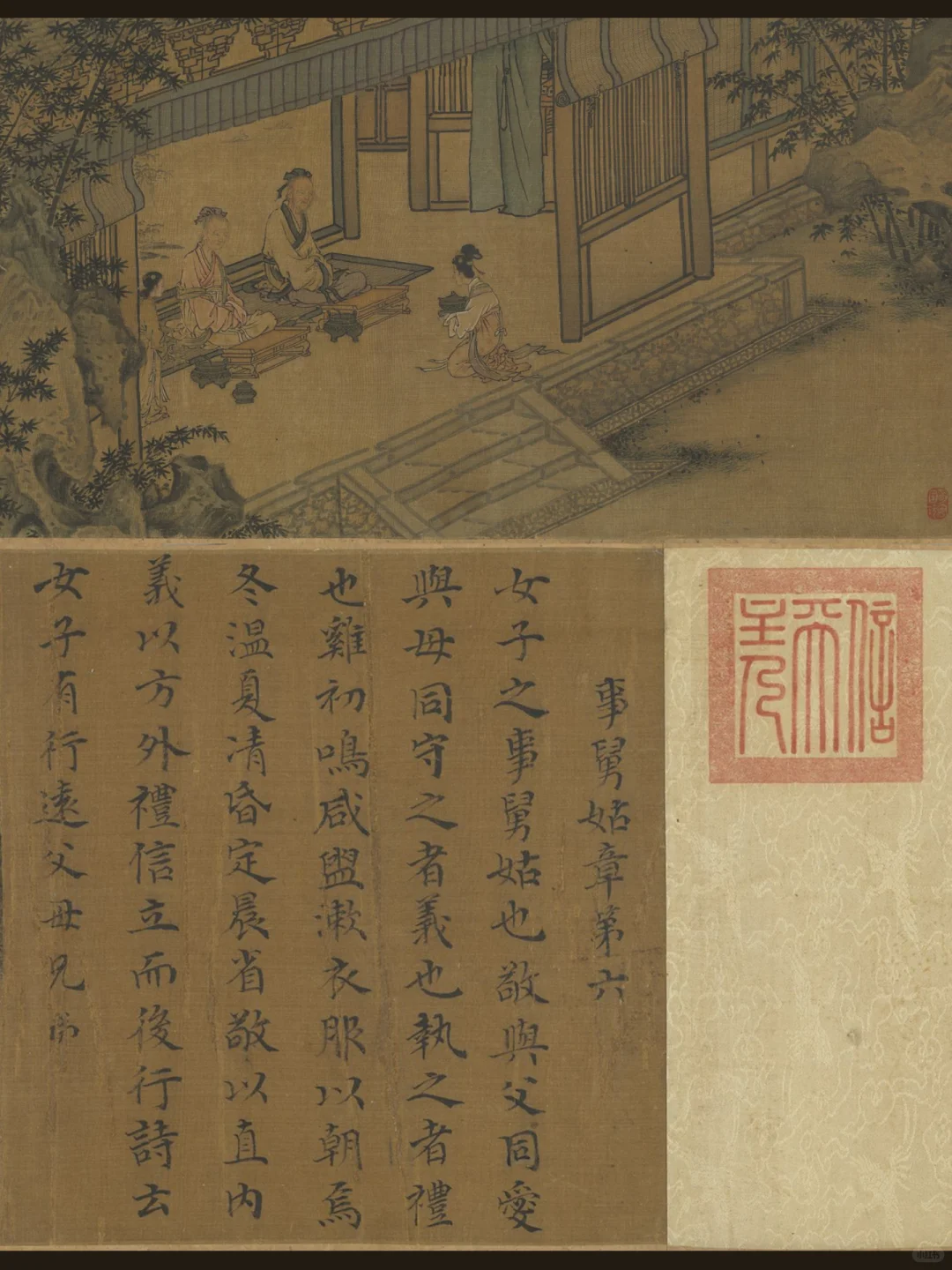 《女孝經》為唐朝侯莫陳(複姓)邈(名)之妻鄭氏因姪女策封為永王妃,恐其未熟悉詩禮,作此經計十八章以獻之,藉以誡告其為婦之道。全文仿《孝經》形制所寫,是封建時代執政者為維護其統治地位,所作教化女姓的禮教經典。全文藉著曹大家的名義,闡述孝道的意義和各種女性禮儀規範。本幅即依《女孝經》的文意所繪,然僅餘九章。全卷依一文一圖形式裝裱而成,每一段皆文前圖後。構圖上以庭院景為主,庭園中的樹石、迴廊、敞軒成為每一段畫面的邊框,中央部份人物穿插其間,構組成文意情節。圖中樹木線條挺健,樹根顯露虯曲,樹枝堅挺拖曳;園石採大斧劈皴兼用淡墨染擦,皆取法自馬遠、夏圭。畫中人物形體鉤勒細謹,面容清雅秀緻,衣紋線條多採「釘頭鼠尾描」,全卷用筆細謹、敷彩雅淡。此圖標名為南宋高宗、孝宗時人馬和之所作。馬和之是高宗紹興年間(一一三一─一一六二)進士,浙江人。善畫人物佛像,高宗深重其畫,每書《毛詩》三百篇,令其圖寫。然而細觀此卷,畫風更趨近於南宋末的院畫家馬遠、馬麟的風格;而本卷楷書定名為高宗所寫,書體實亦接近宋理宗,故此卷或可訂名為<宋人書畫女孝經>為當。