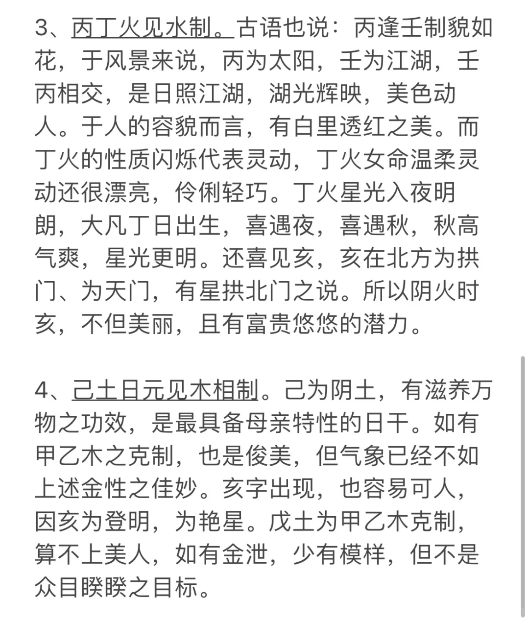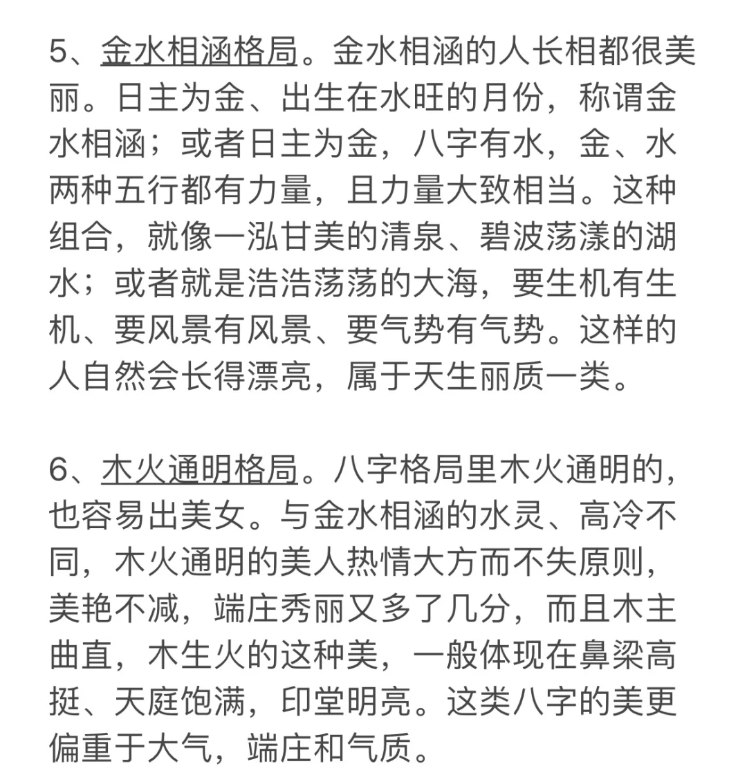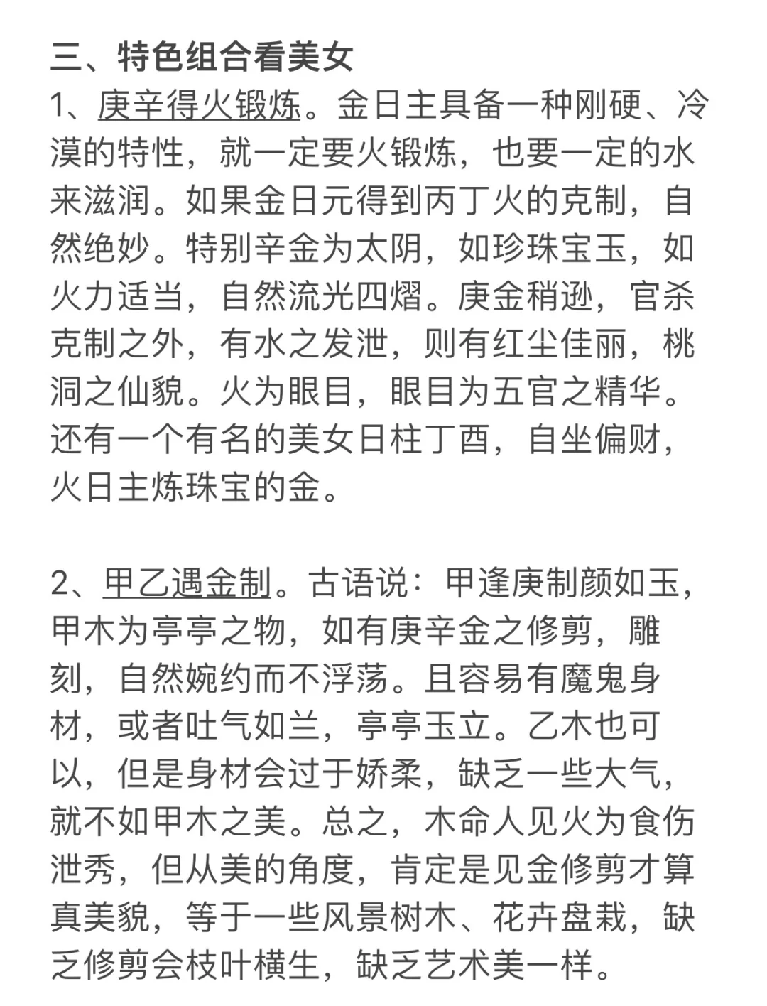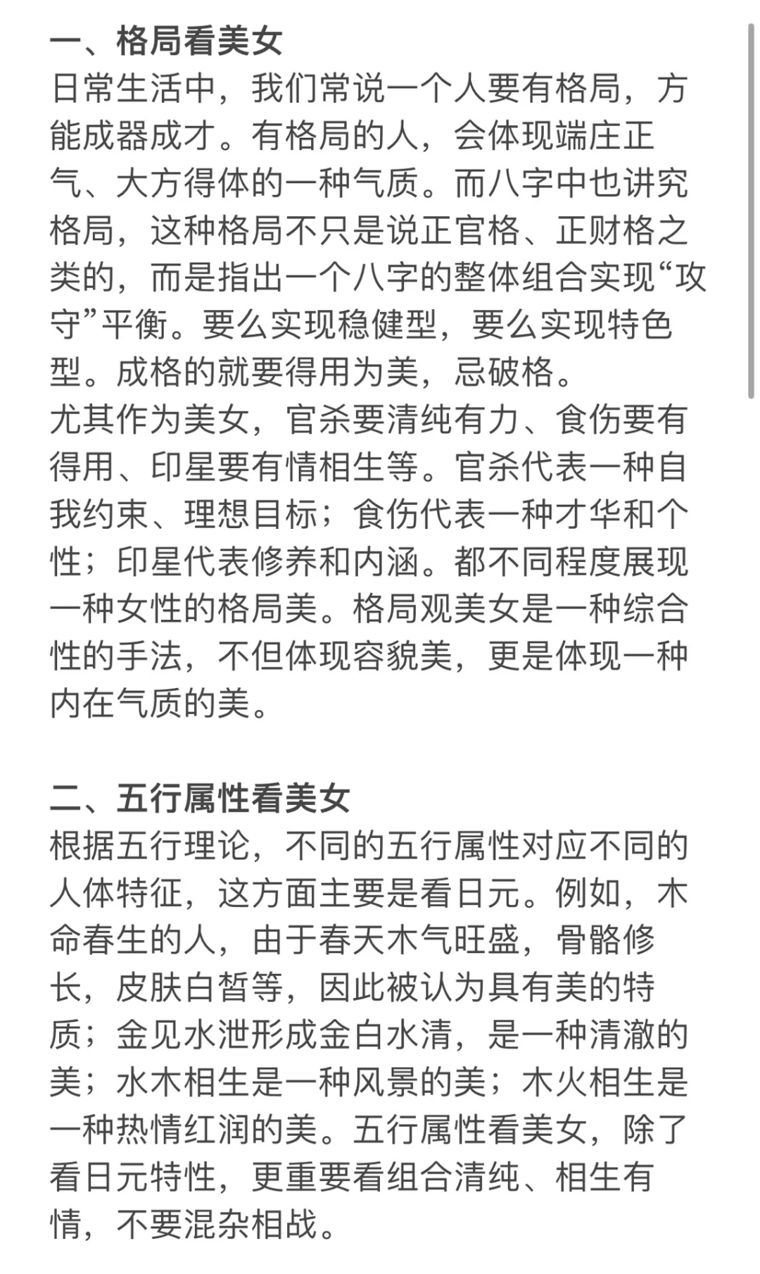 归纳起来,由于美女的展现,主要是通过雕刻力(官杀),展现力(食伤)来体现。有官杀制身、食伤泄秀,多为美女。然后再看8字组合是否生泄平衡、制化得当、五行属性等等看层次。
