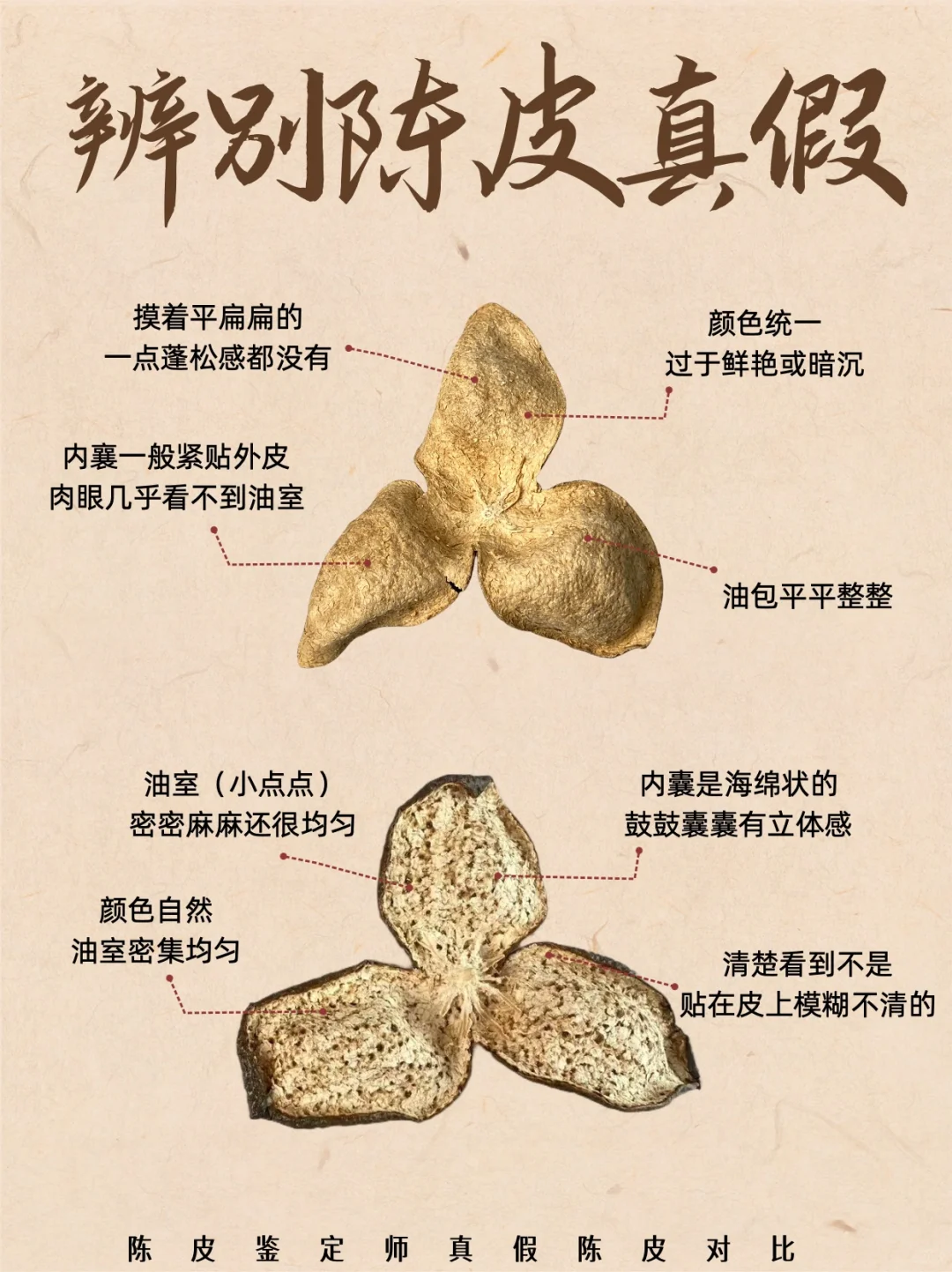 谁懂啊!花大价钱买的 “新会陈皮”,泡了才发现是染色工艺皮!今天用 4 张对比图,把生晒真皮和假工艺皮扒得明明白白,宝子们按图对照,再也不踩坑!