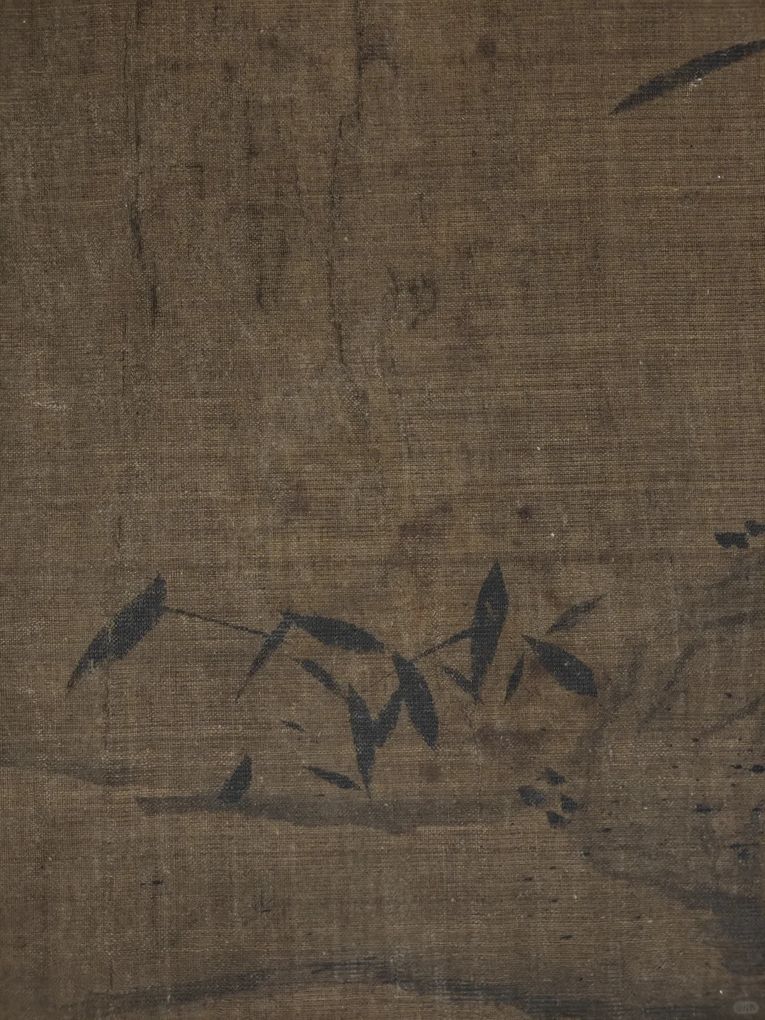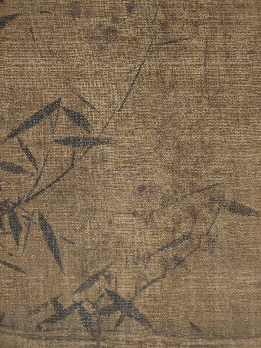 《潇湘竹石图》中亦可看到浓淡不一的竹叶,从竹子长势分析,有些以淡墨画出者殊无解释成叶背的可能。特别是所画之末端翻卷的竹叶,墨色全然如一,并未因翻出背面而有浓淡之别。其所以杂用浓墨淡墨,为了使画面富于变化,且使本来相当密集的竹叶不给人以壅塞之感。在这幅画上,用淡墨所画之叶为数不少,在用浓墨画出的叶子中作无规律的穿插,而为了整体的连贯性,遂在叶间增加许多小枝。