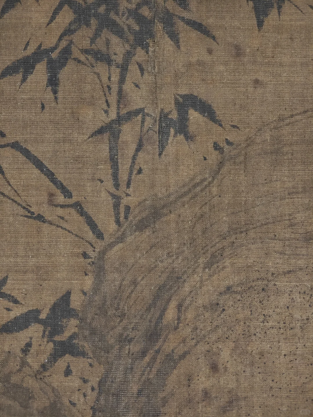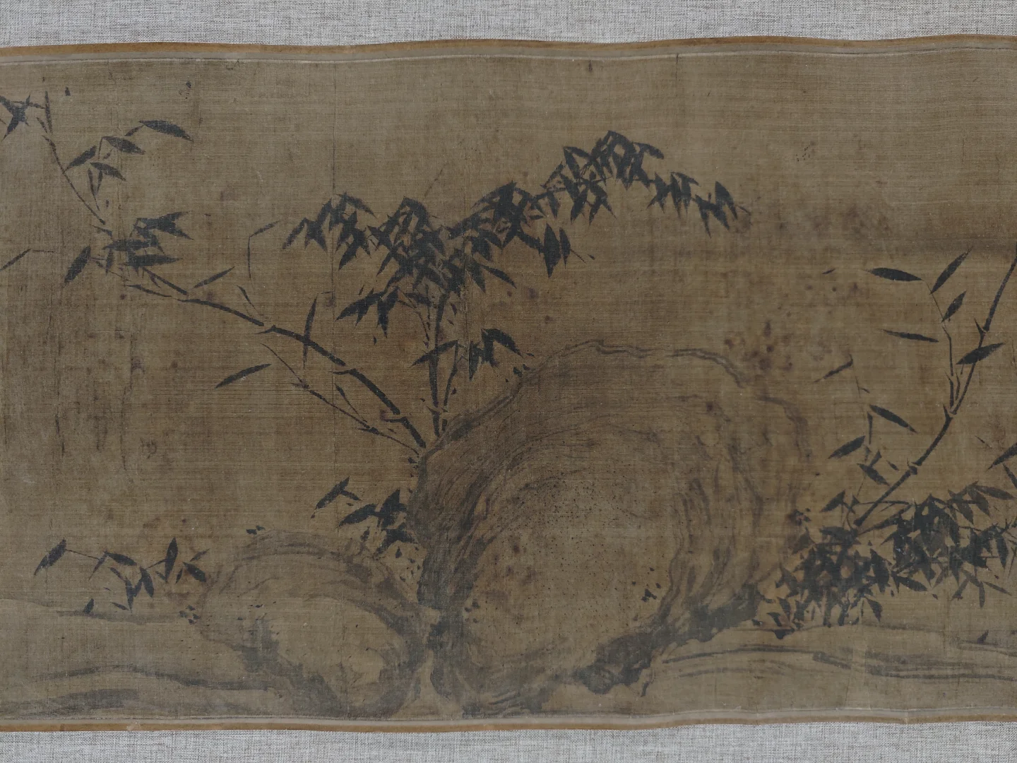慢慢的又露出了“风枝雨叶瘦土竹,龙蹲虎踞苍藓石”和湍流之水,此图画石“磊落雄壮,苍硬顽涩,矾头菱面,层叠厚薄,覆压重深”,写竹“其茂梢劲节,吟风泻露、拂云筛月之态,无不曲尽其妙”,其水则犹如“输泻跳蹙之势,汹汹欲崩屋”。