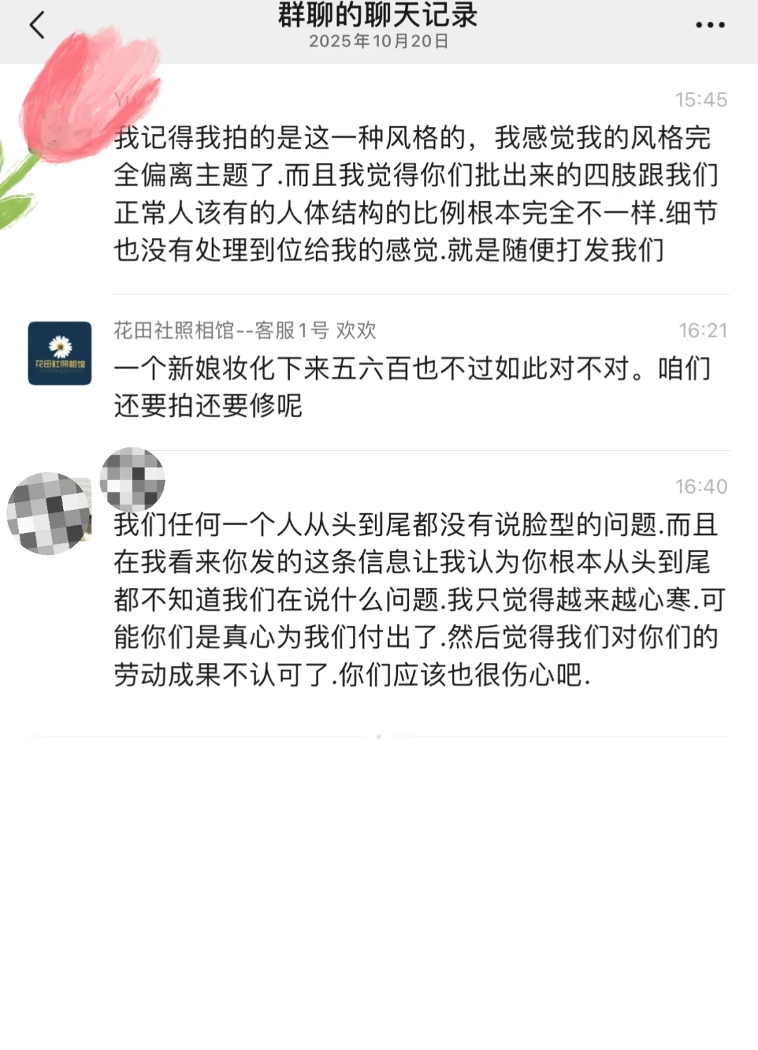 姐妹们,今天必须给大家避雷一家名叫“花田社照相馆”的店!本来满心欢喜去拍一组美美的照片,结果拿到手的成片直接给我整懵了——修图师怕不是对“正常人的身材比例”有什么误解吧?