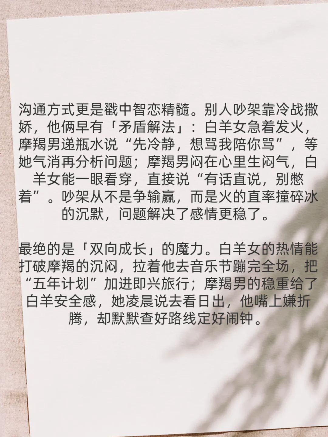 沟通方式更是戳中智恋精髓。别人吵架靠冷战撒娇,他俩早有「矛盾解法」:白羊女急着发火,摩羯男递瓶水说“先冷静,想骂我陪你骂”,等她气消再分析问题;摩羯男闷在心里生闷气,白羊女能一眼看穿,直接说“有话直说,别憋着”。吵架从不是争输赢,而是火的直率撞碎冰的沉默,问题解决了感情更稳了。