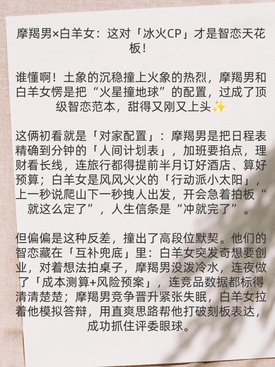 谁懂啊!土象的沉稳撞上火象的热烈,摩羯男和白羊女愣是把“火星撞地球”的配置,过成了顶级智恋范本,甜得又刚又上头✨