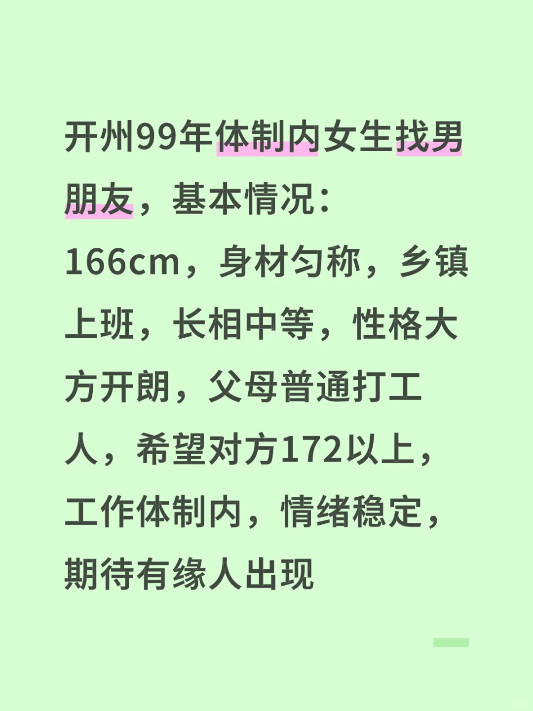 开州99年体制内女生找男朋友,基本情况:166cm,身材匀称,乡镇上班,长相中等,性格大方开朗,父母普通打工人,希望对方172以上,工作体制内,情绪稳定,期待有缘人出现
