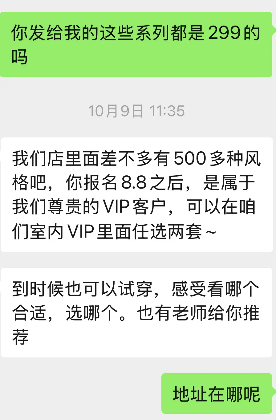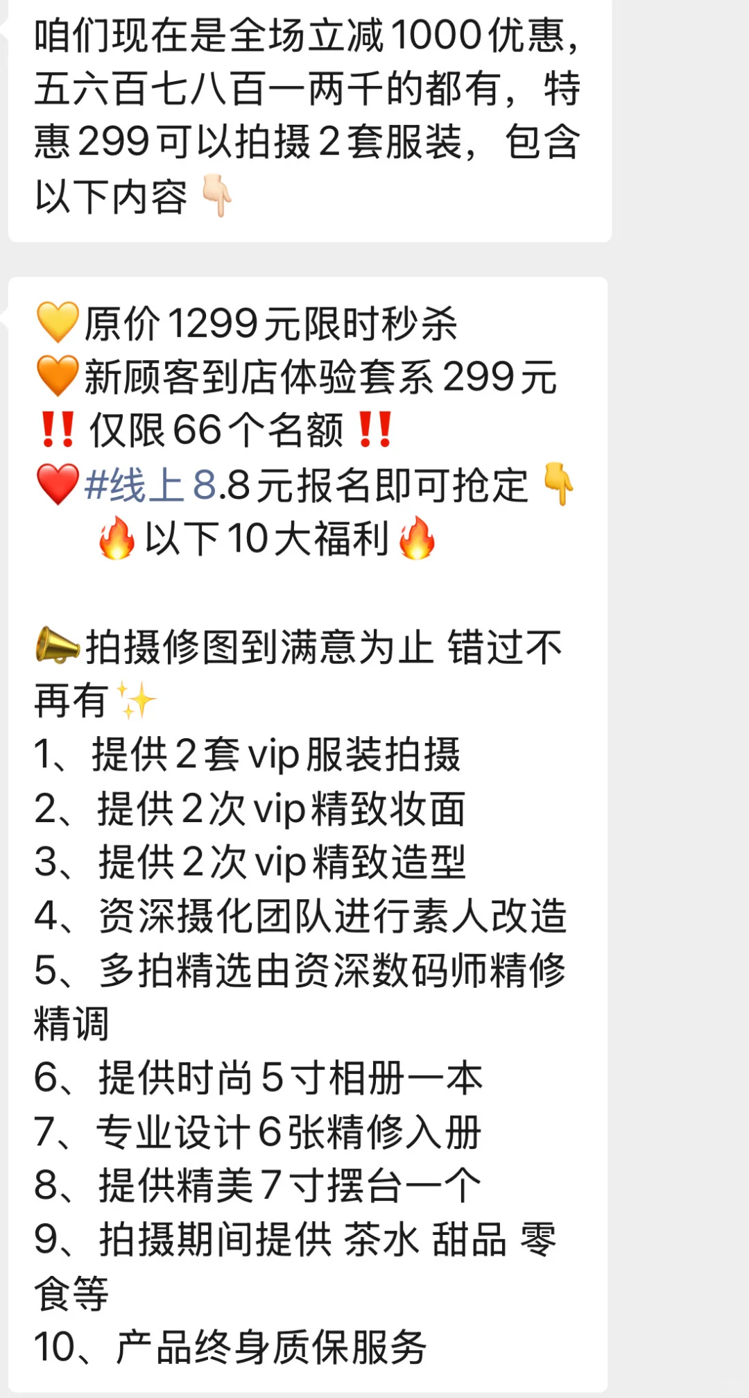 从📕加了济南某写真店客服,明确说过299vip 待遇,去了可以选择很多系列拍摄,到店之后先让我们在平板选择自己喜欢的系列,我和我的朋友认为,这些系列299都可以选,选择完毕后,工作人员来给我们介绍,先是套近乎,问我们从哪里来,做什么工作,之后就说我们选的这些系列需要加钱才能拍,299只能选择一个黑白照系列,其余都要加钱,我和我的朋友本来想如果加的价格符合我们心理预期也就拍了,结果直接从299拉到1699到没有上限,并且299的拍出来没有电子版,谁拍写真不想要电子版!结果要电子版需要加钱,一张150!