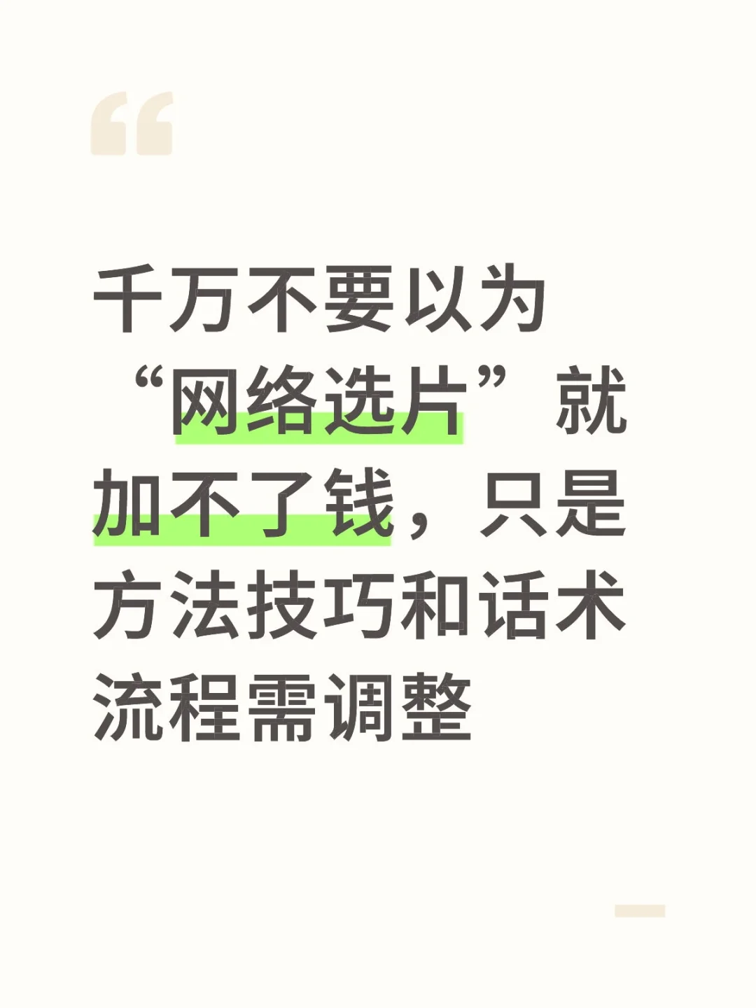“网络选片”就加不了钱,只是方法技巧和话术流程需调整,网络选片是未来的趋势,马上就要流行线上选片和到店选片双轨并行的局面,客人在订单的时候更愿意选择让她舒服的方式,你可以不改变,但你的竞争对手可已经改变了,您看您想不想要了解一下…………