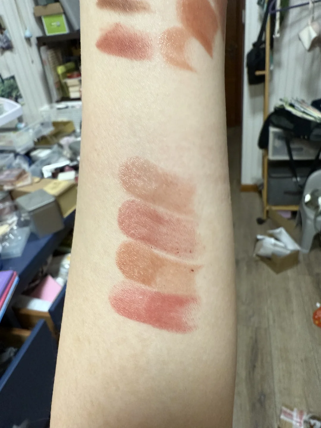 我是一个浅唇薄唇 图三打底了但是仍然一点都不上色 这真的太痛苦了 我要的是口红不是润唇膏 我需要覆盖力啊啊啊 现在四个颜色上嘴真的只是透明然后略有颜色 1最明显也最好看 (但基本上 13上嘴一样 因为3不是想象中的通透的红棕红茶 而是很淡的一抹唇色。24两个裸杏色 无论是手臂上还是嘴上真的基本一模一样)