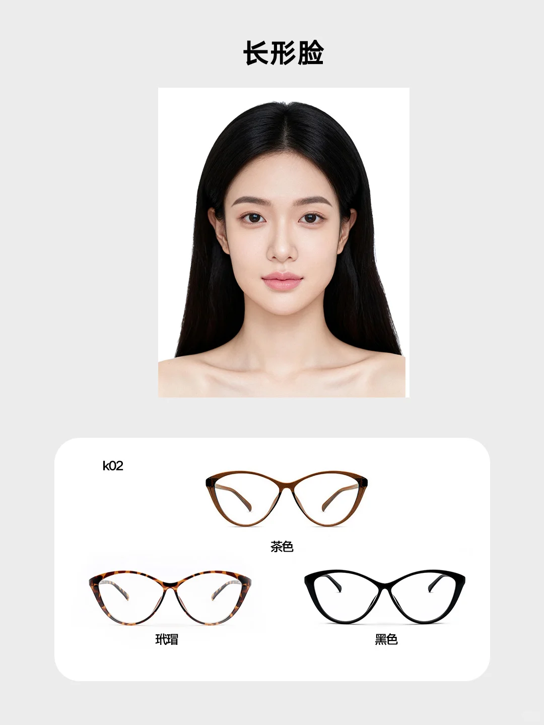 脸部纵向延伸感强,可挑选宽幅较大的镜框,或是带有撞色设计、花纹装饰的款式,在视觉上缩短脸部长度,同时提升造型的时尚度,打造个性风格🎨。
