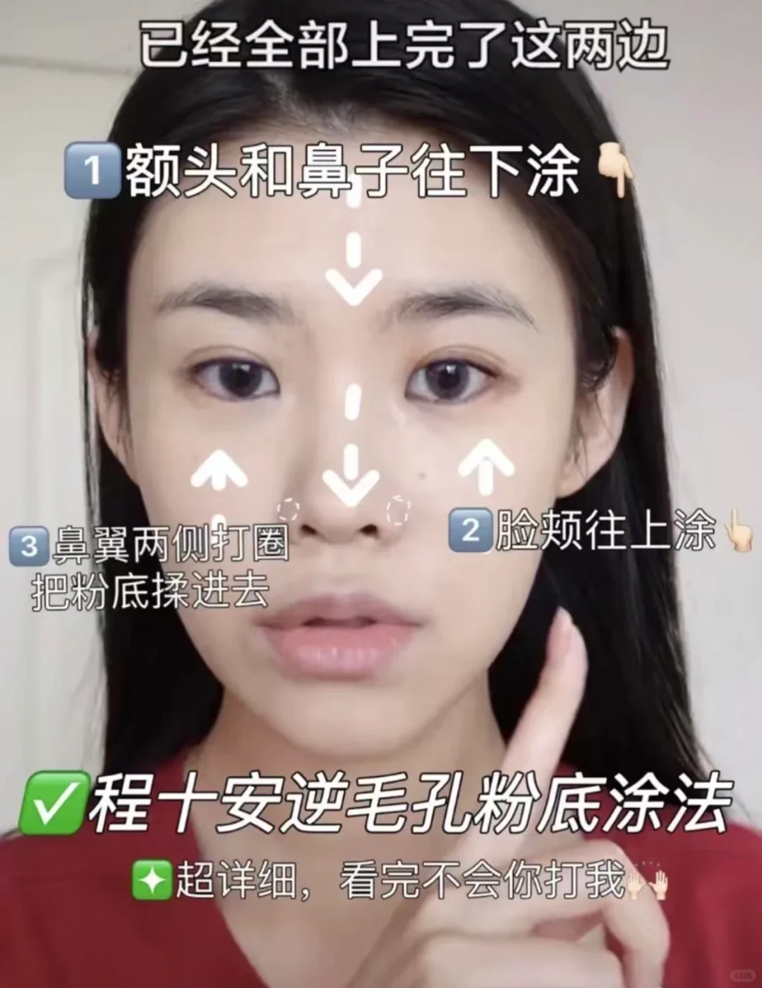 1⃣️挤一大坨素颜霜在手背上,喷几下定妆喷雾在里面然后揉开,用手指像刮腻子一样按照p2的手法抹在脸上,定妆喷雾喷在粉扑上几下,然后用粉扑拍开。