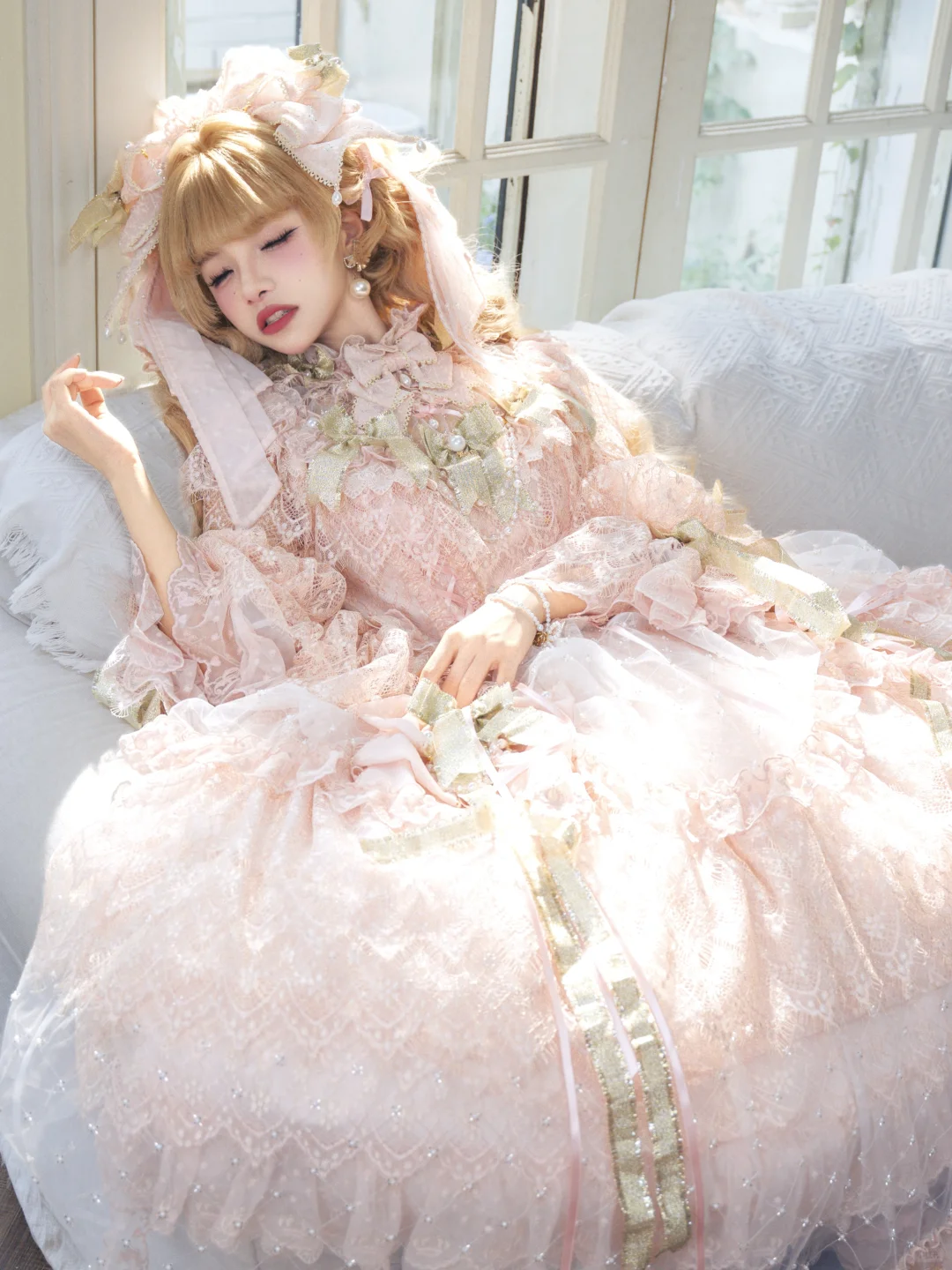 薄雾与曦光吻过蕾丝卷翘的睫,露珠在裙摆上碎成星屑。