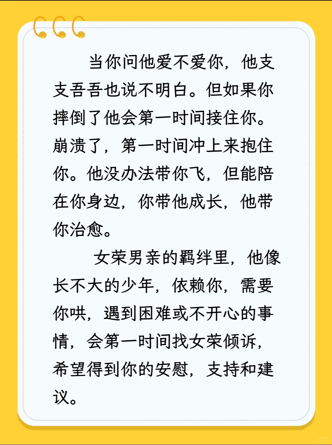 女荣男亲的羁绊里,他像长不大的少年,依赖你,需要你哄,遇到困难或不开心的事情,会第一时间找女荣倾诉,希望得到你的安慰,支持和建议。