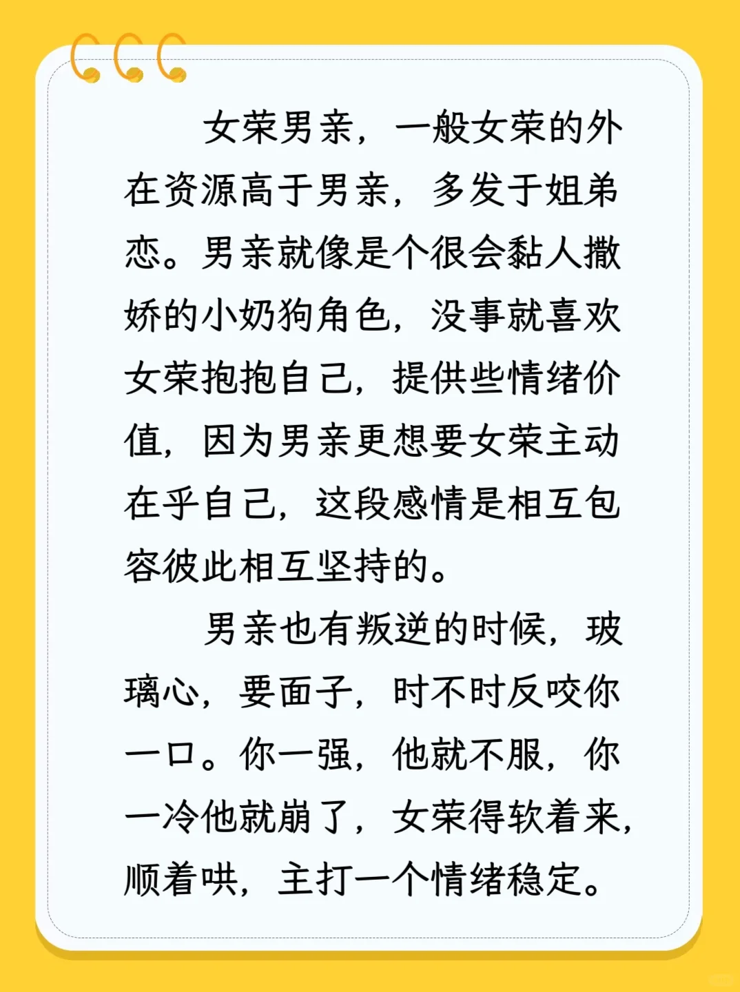 女荣男亲,一般女荣的外在资源高于男亲,多发于姐弟恋。男亲就像是个很会黏人撒娇的小奶狗角色,没事就喜欢女荣抱抱自己,提供些情绪价值,因为男亲更想要女荣主动在乎自己,这段感情是相互包容彼此相互坚持的。