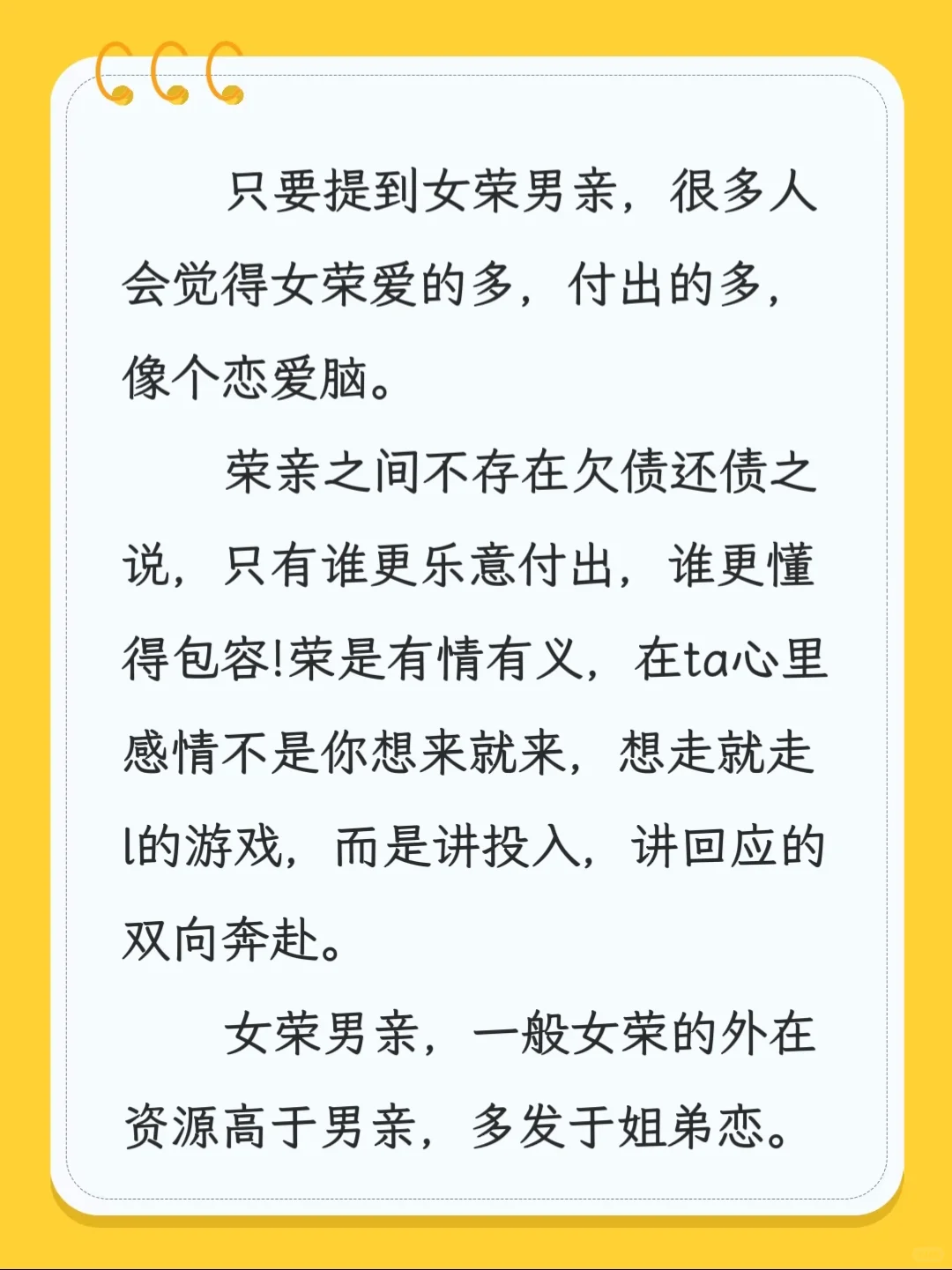 只要提到女荣男亲,很多人会觉得女荣爱的多,付出的多,像个恋爱脑。
