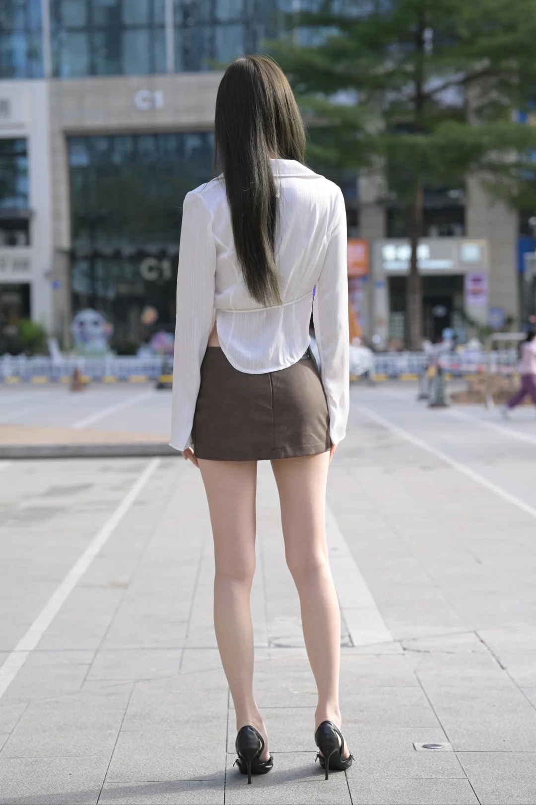 飘带白衫松垮垂落,勾出隐约肩颈线条;棕褐短裙掐住腰臀弧度,每一寸都藏着轻熟张力。