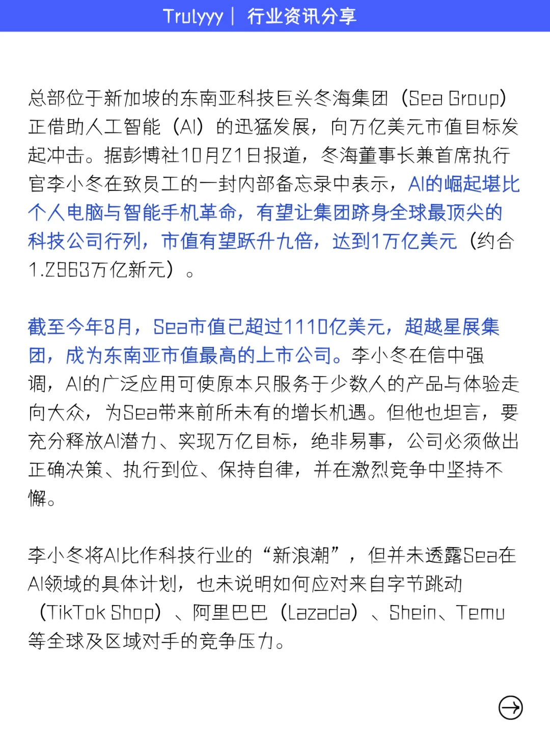 ✍️近日,冬海集团(Sea Group) 因其创始人李小冬在内部备忘录中的发言再次引发市场关注。随着人工智能(AI)技术的快速演进,Sea有望通过把握这一轮技术变革,实现市值增长九倍,🎯迈向1万亿美元(约合1.2963万亿新元)的长期目标。