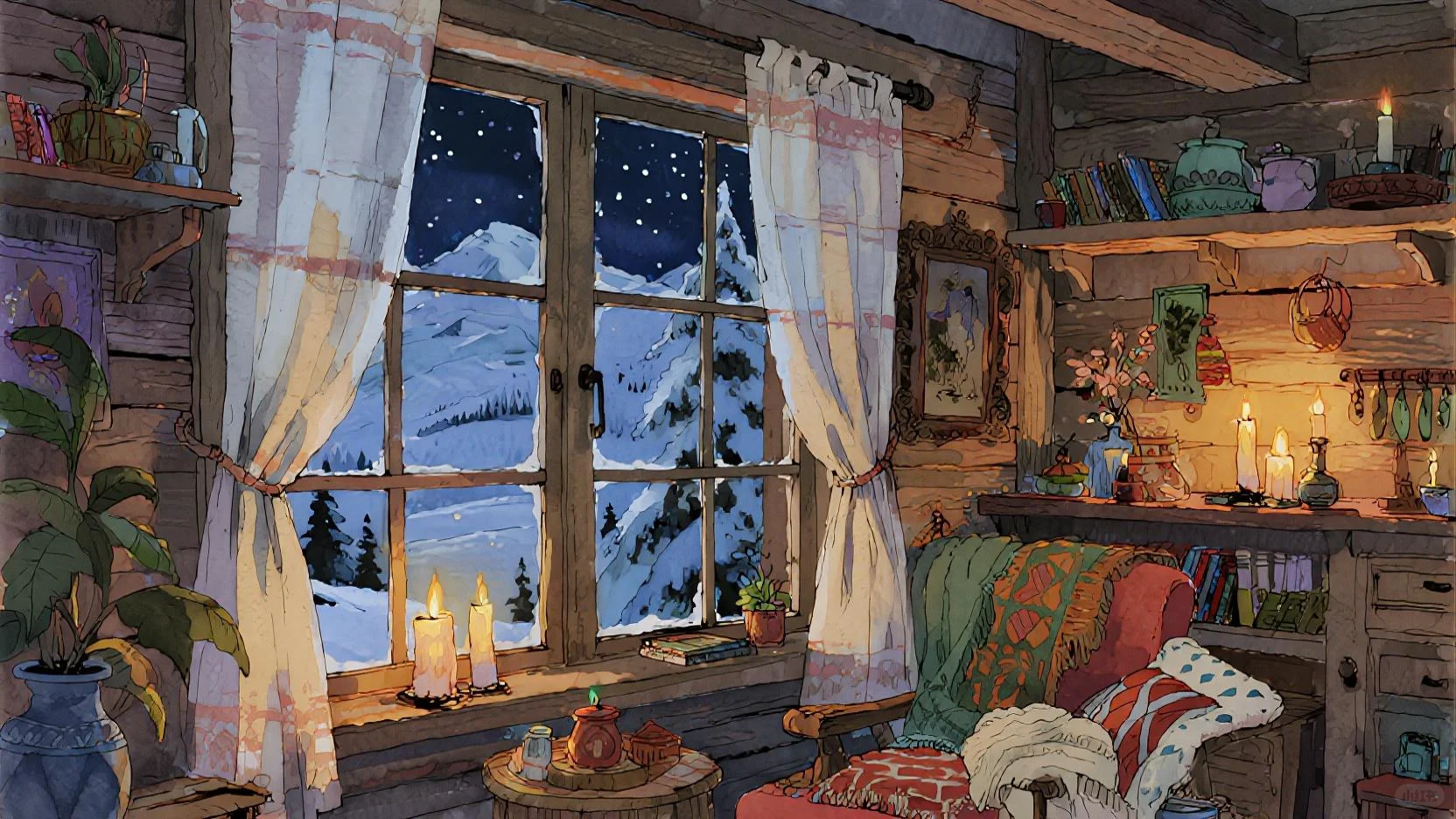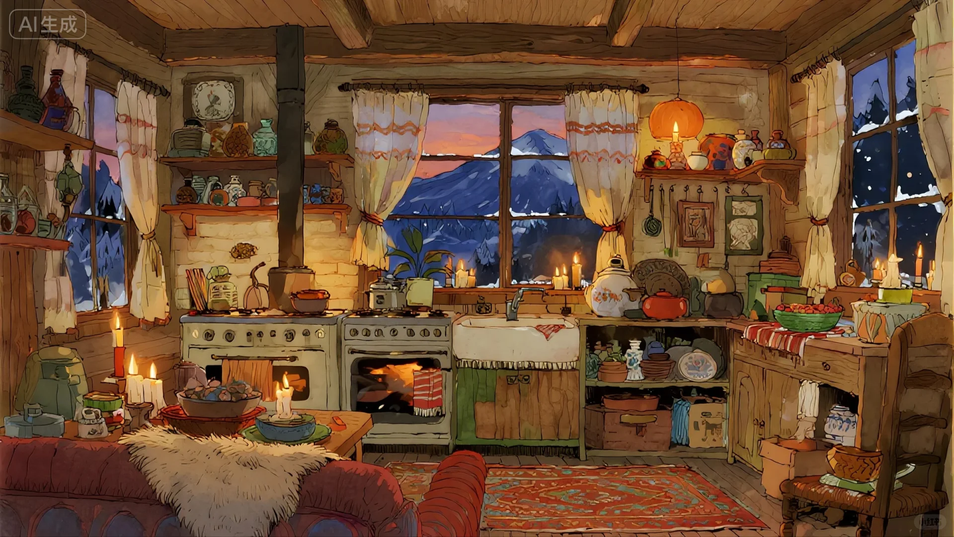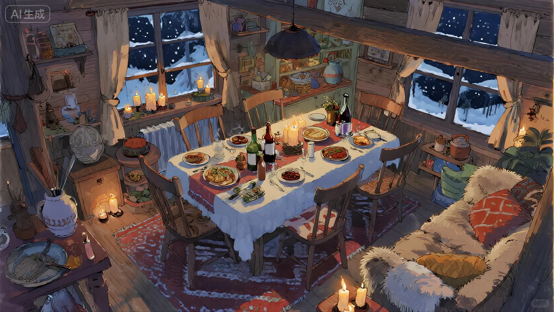 横屏壁纸|烛光晚餐,雪原中的小木屋