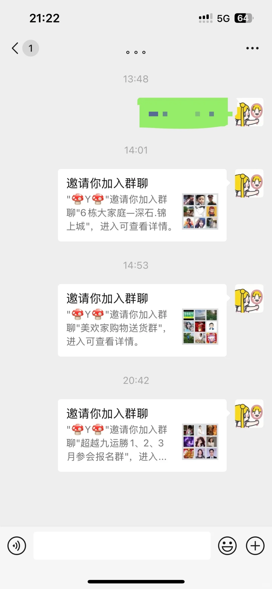 自从扫了路边的二维码之后,要注意了,下载什么杀毒软件是没用的,因为那个人就是操作了你的各种群,对他发出邀请,他一开始白天的时候先不通过进群,到了半夜,1-2点,趁你要睡觉的时候,开始侵占你的各种群!!所以,你一但遇到了,一定还要跟他死磕到底!!一点多的时候他每邀请一次,我马上按取消,他一直进群,我一直取消。当然群太多,也有漏网之鱼,还是让他们发了两个减肥广告出来!!不过还好,起码第二天没有名誉扫地🧹