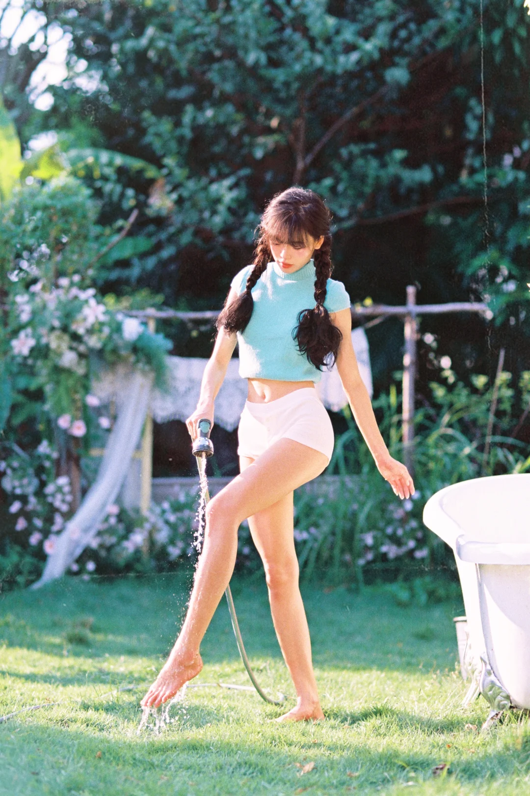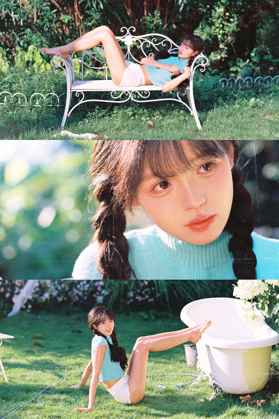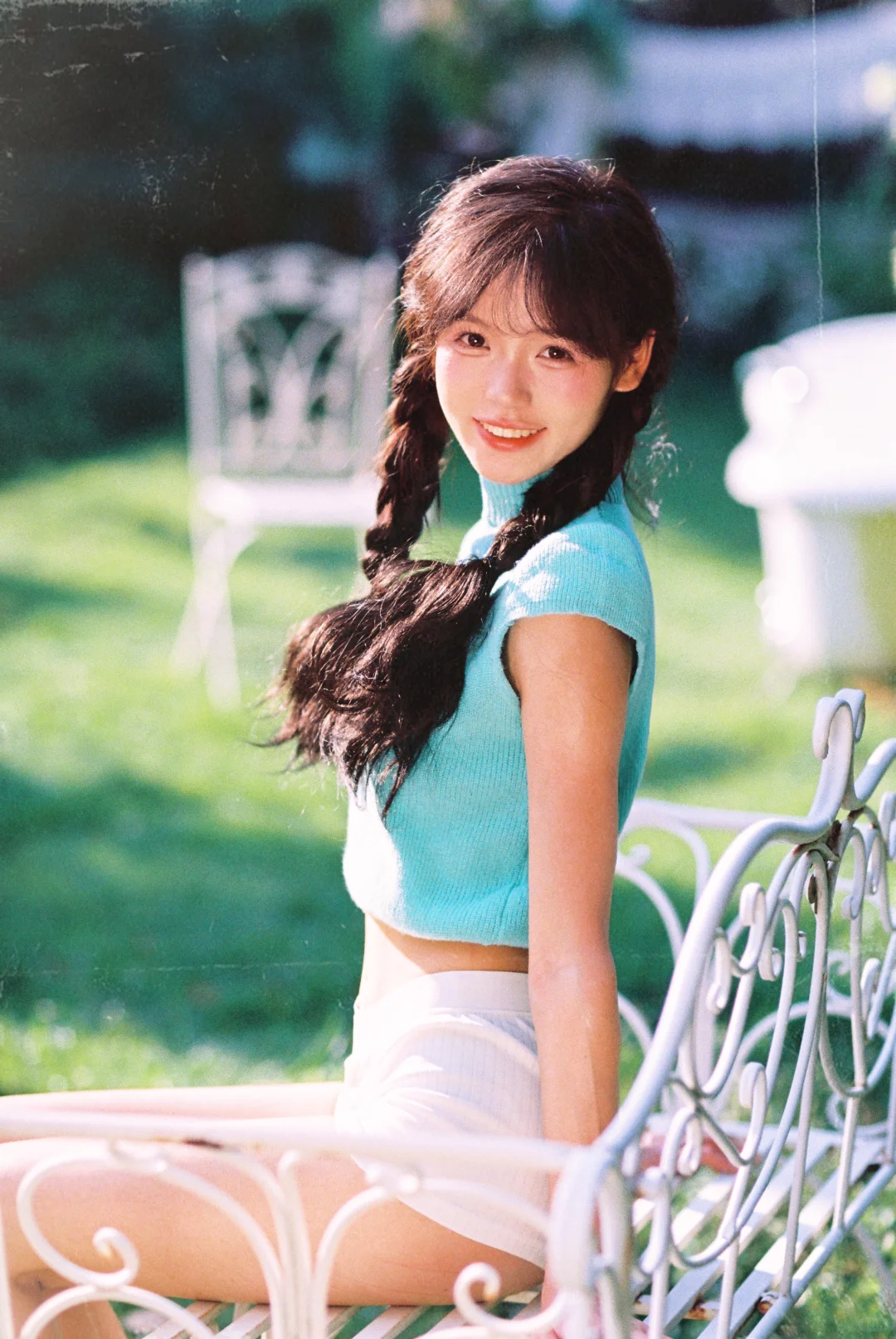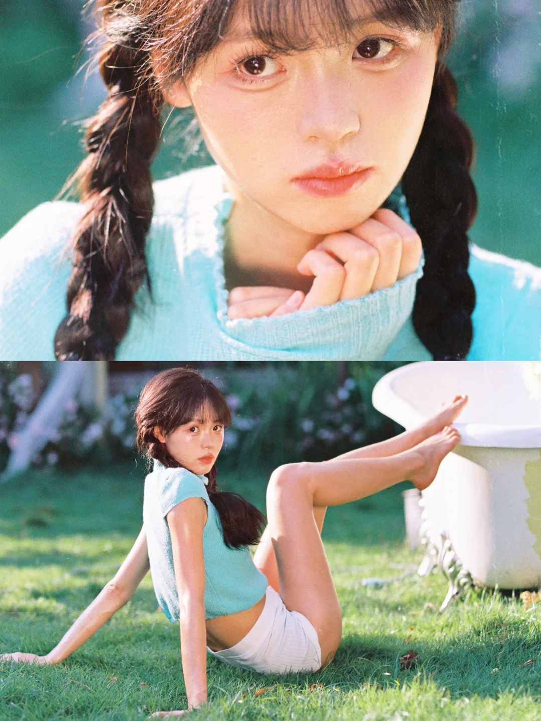 写真穿搭tips:蓝色短袖针织衫上衣,搭配白色短裤,徐若瑄同款写真服,复古少女感get!