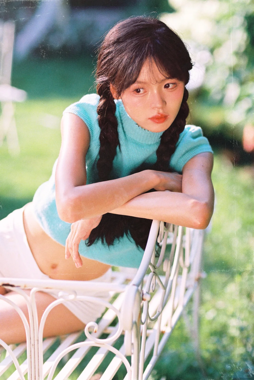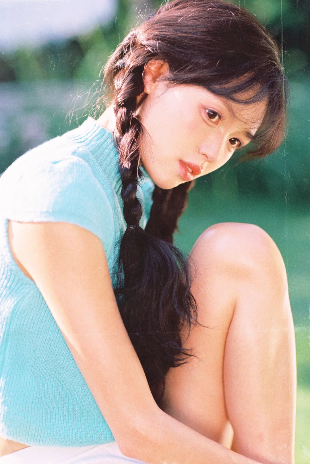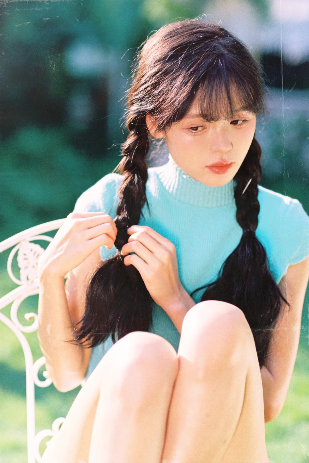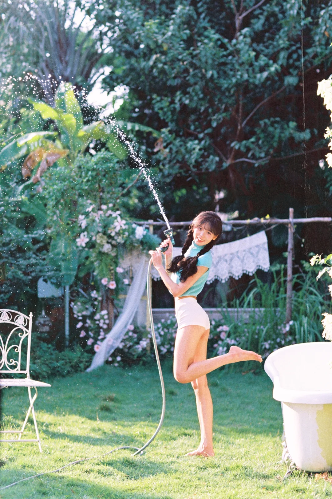 写真穿搭tips:蓝色短袖针织衫上衣,搭配白色短裤,徐若瑄同款写真服,复古少女感get!