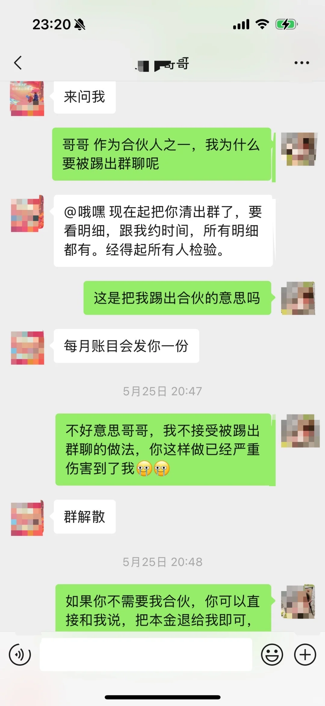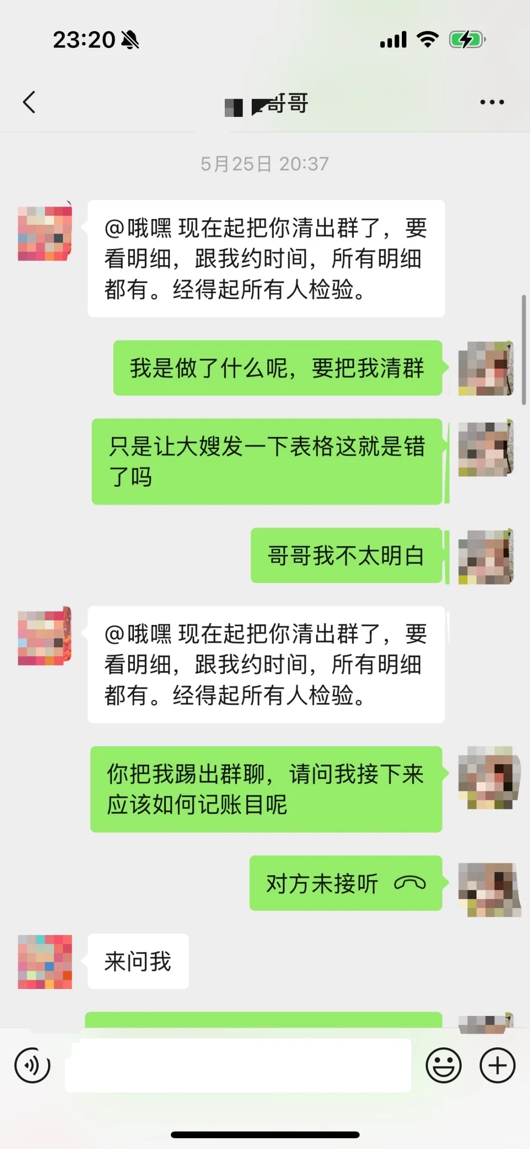 2025.05.25被踢出群聊当晚我就找他理论,可是他一直发群里的那段言语给我,并且拒绝和我沟通。