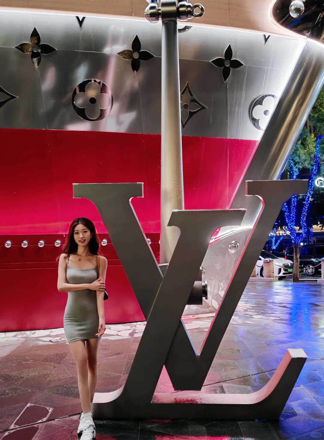 3️⃣ 人景融合:站在lv巨轮边,手比耶✌🏻,灯光打在裙上像自带滤镜~✨