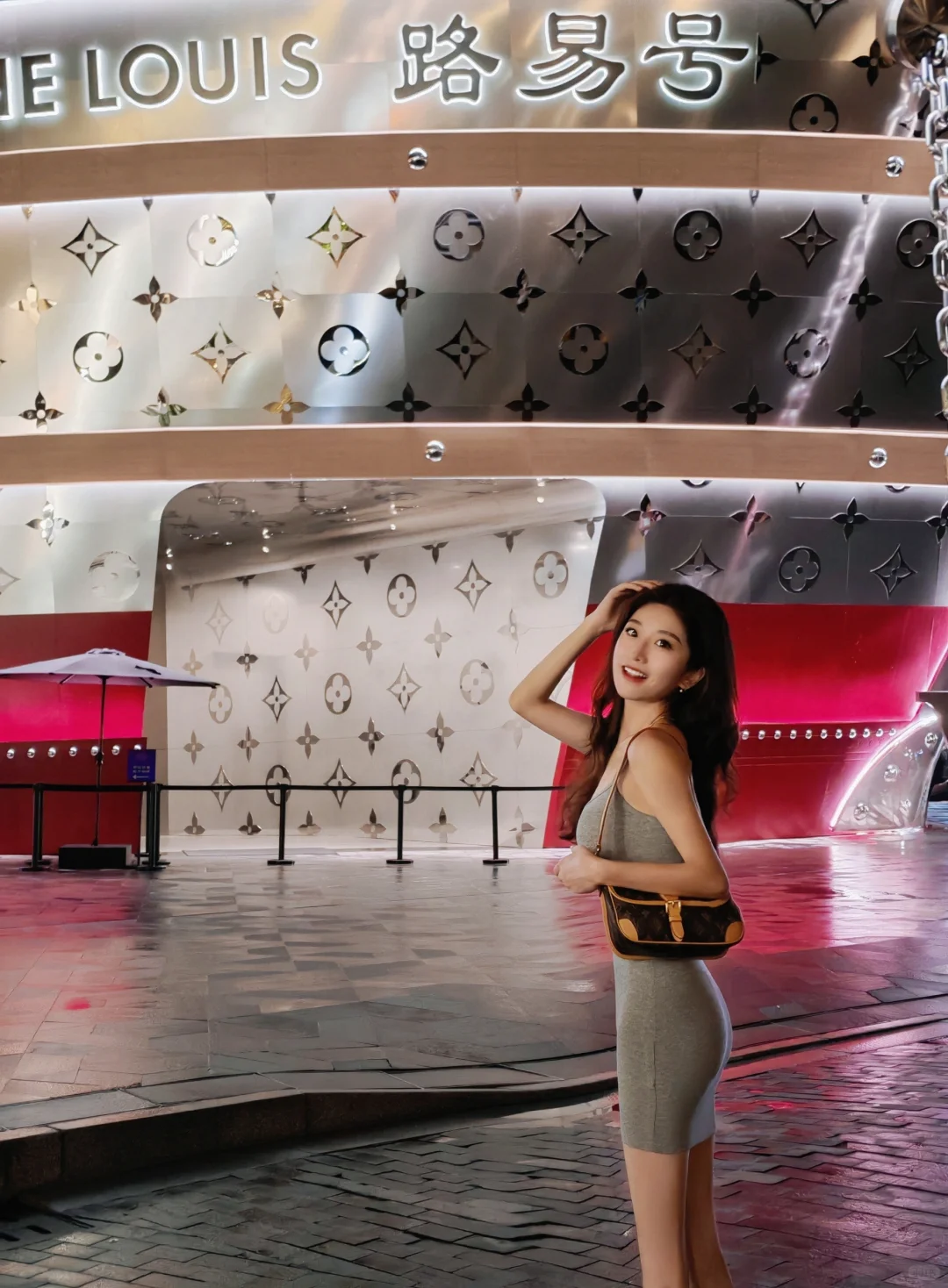 终于打卡到了最近魔都最火的打卡地LV巨轮⛴啦~穿上一条短款灰色包臀连衣裙,在lv巨轮的灯光下怎么拍都非常美,而且穿着这套连衣裙超级显身材~💥再搭配银色项链+小耳钉,还有我的小包包,整套穿搭被夸爆啦~