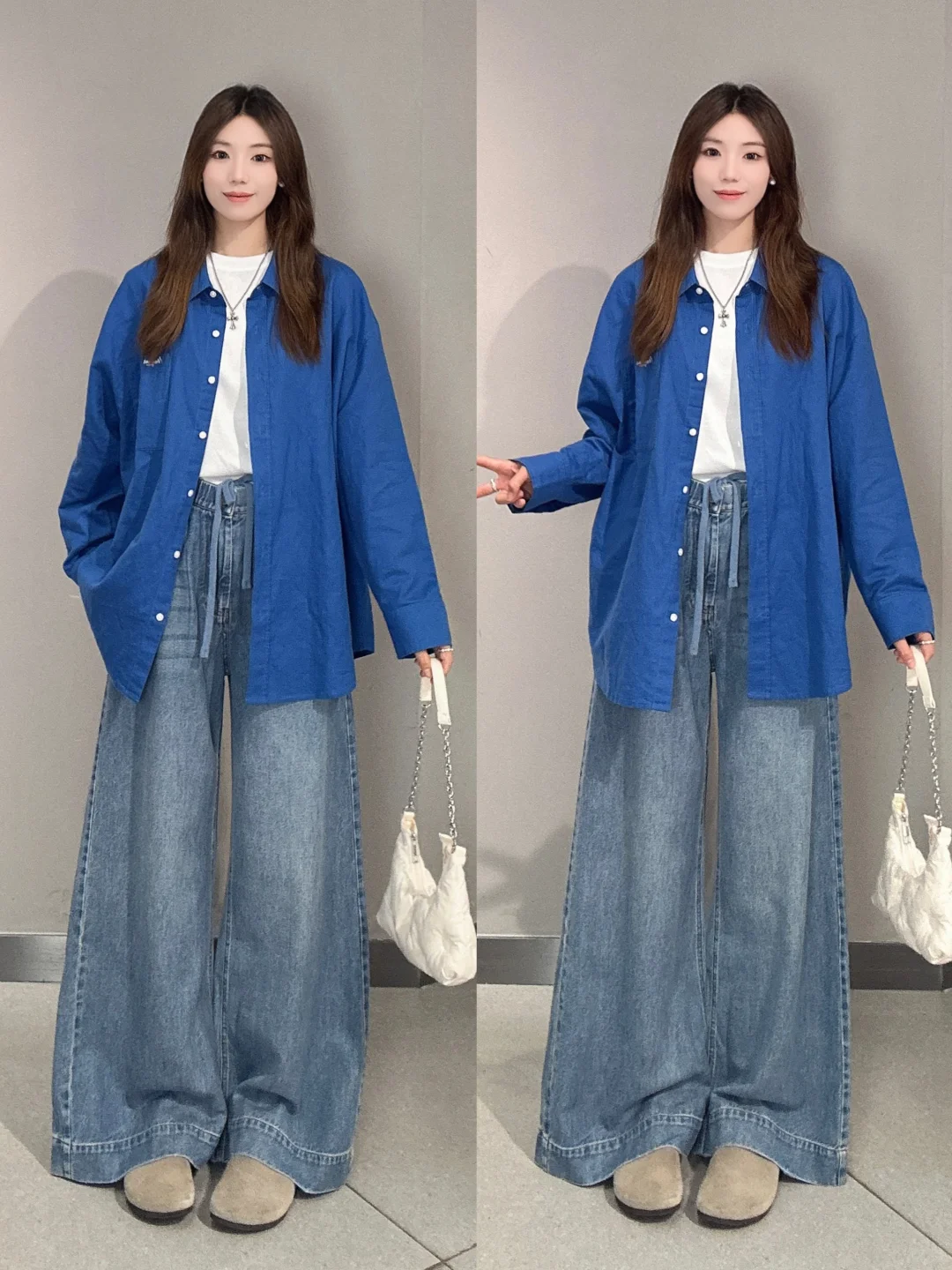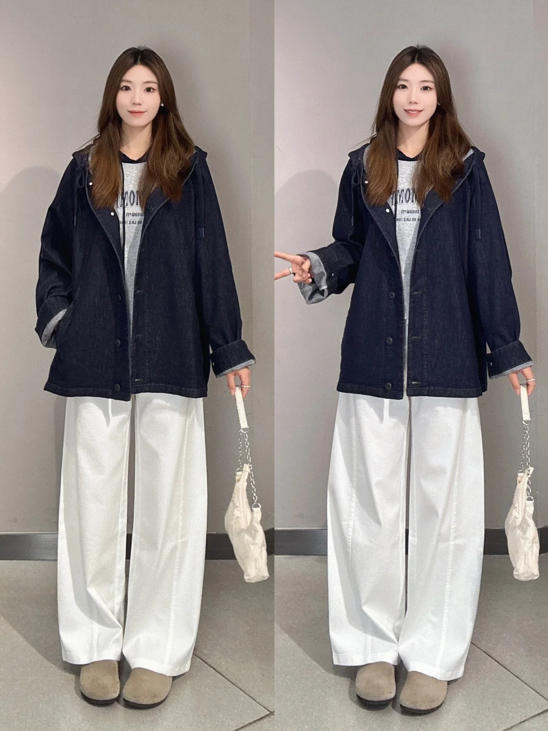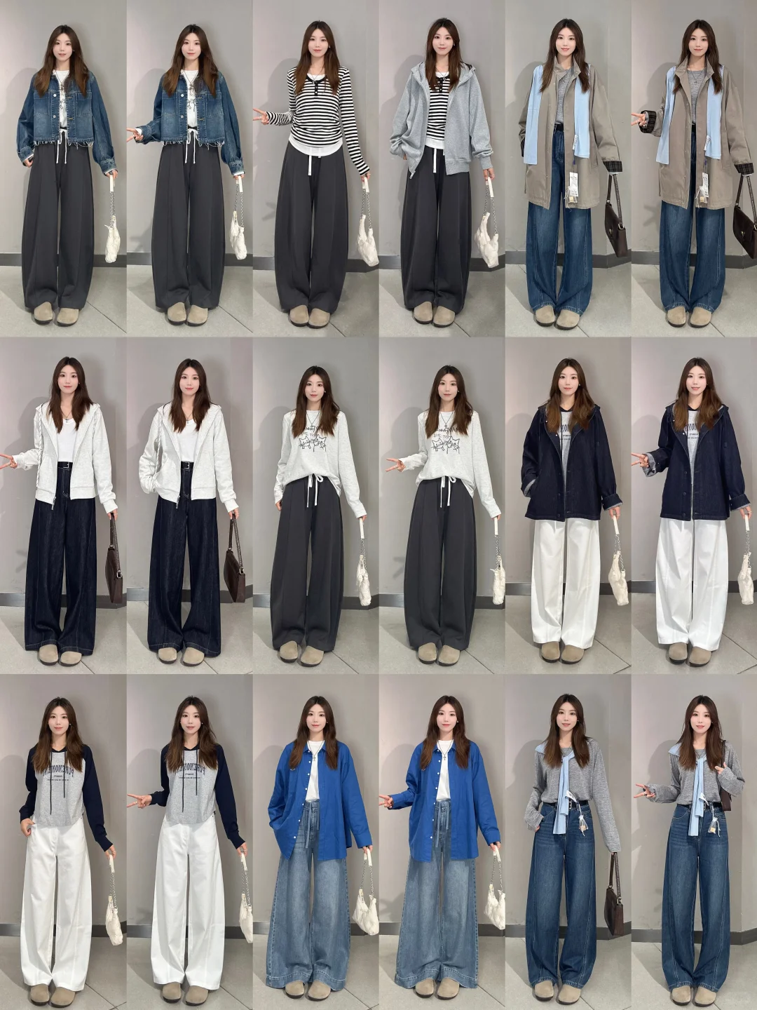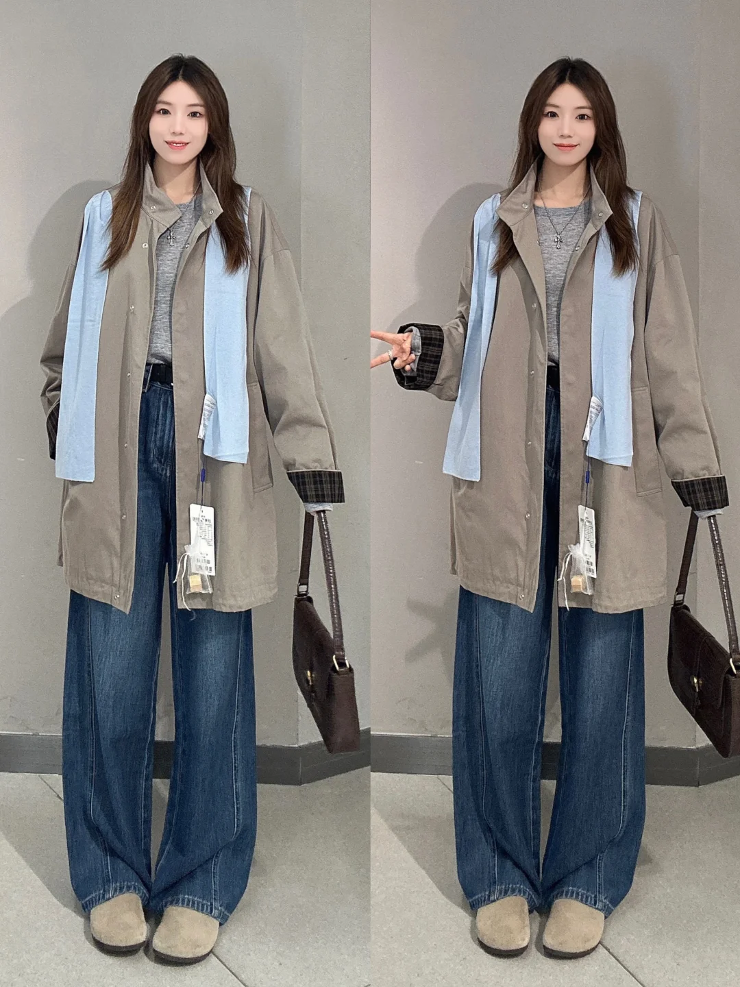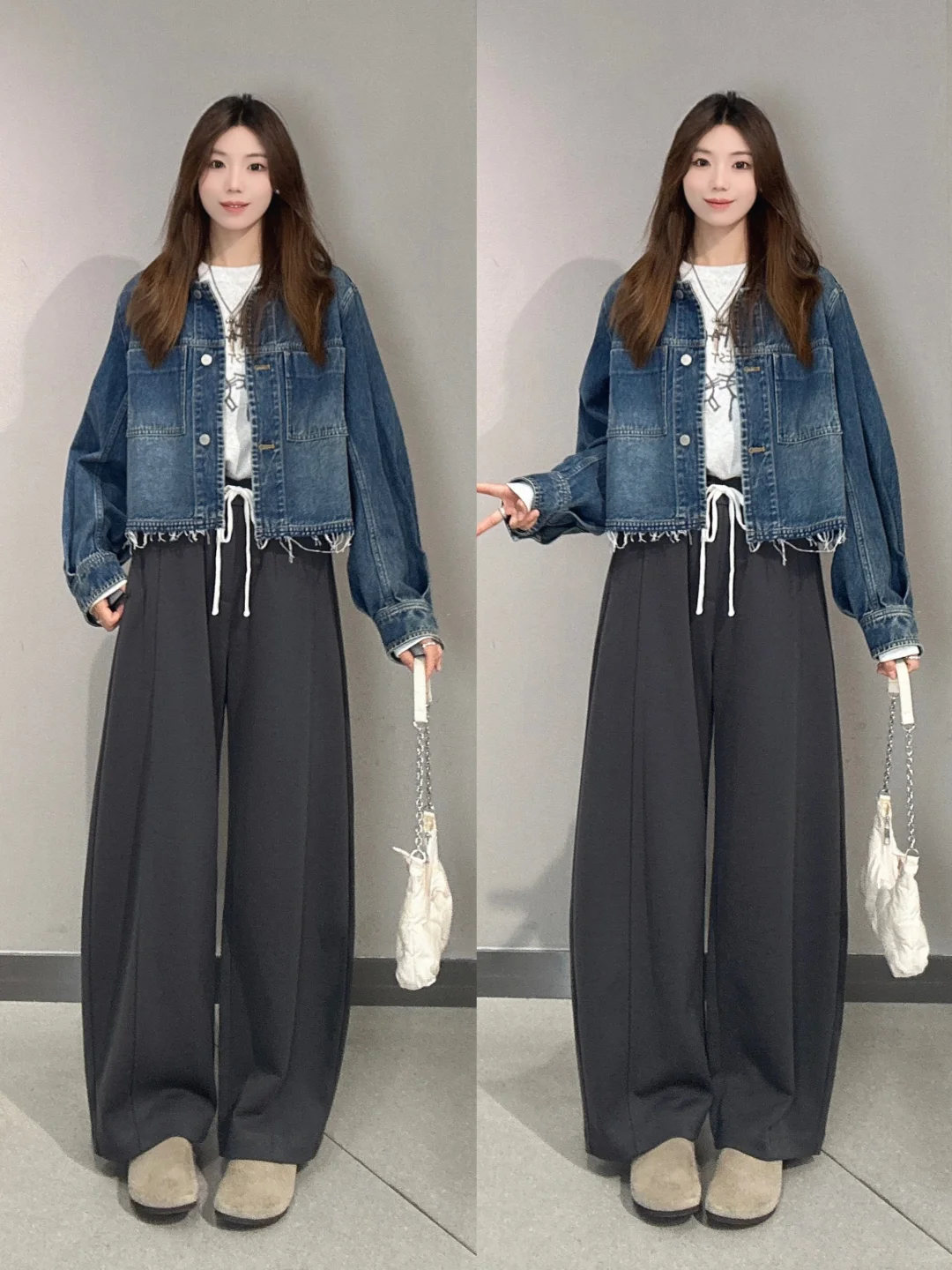🧥牛仔外套+拖地裤:经典的牛仔外套,