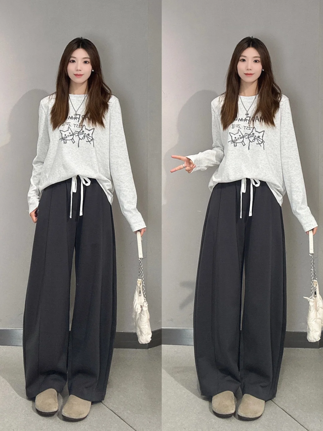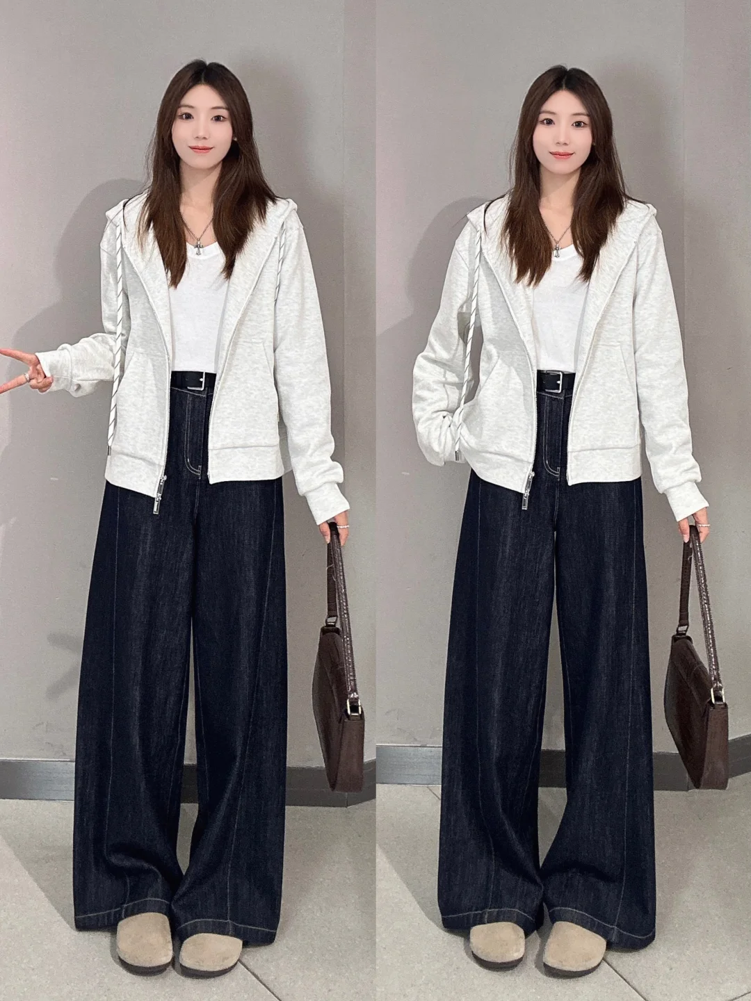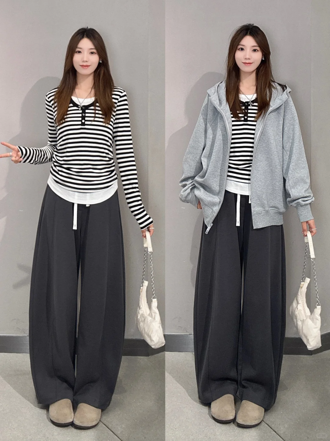 🧢连帽卫衣+阔腿裤:连帽卫衣真的是松弛感的代表选手,随意又舒适。搭配上阔腿裤,不仅能遮住腿部的小瑕疵,还能营造出慵懒的感觉。脚上再踩一双软软的豆豆鞋,主打一个舒适又好看,是我能从早穿到晚的一套!