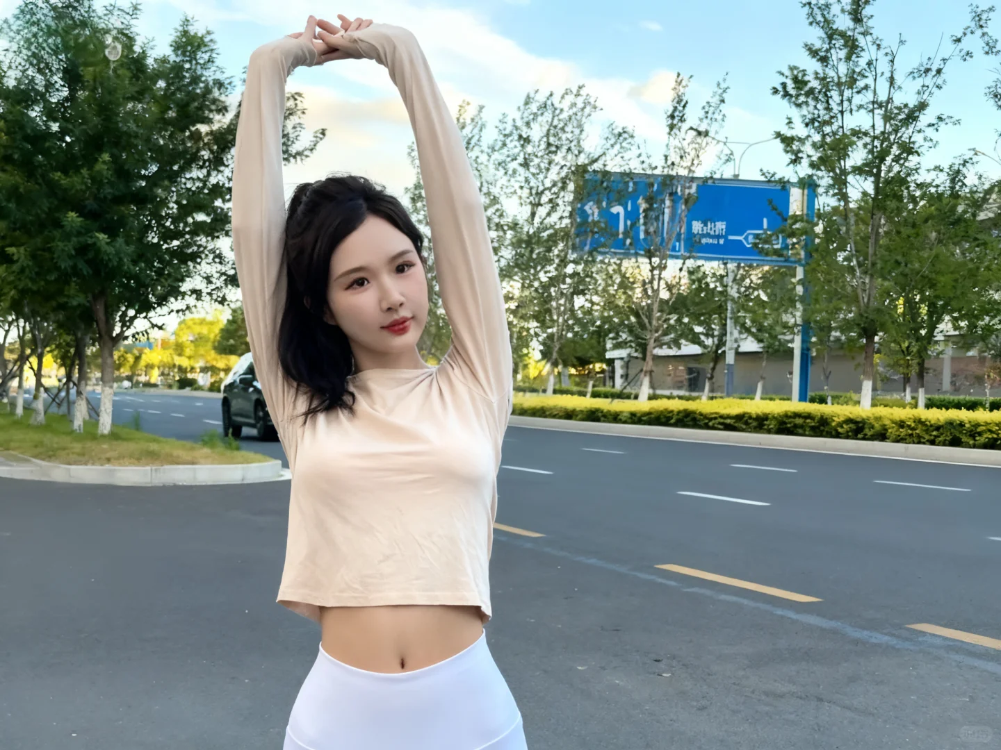 人物以浅米色短款长袖上衣搭配白色紧身裤,打造清新简约的运动风造型。