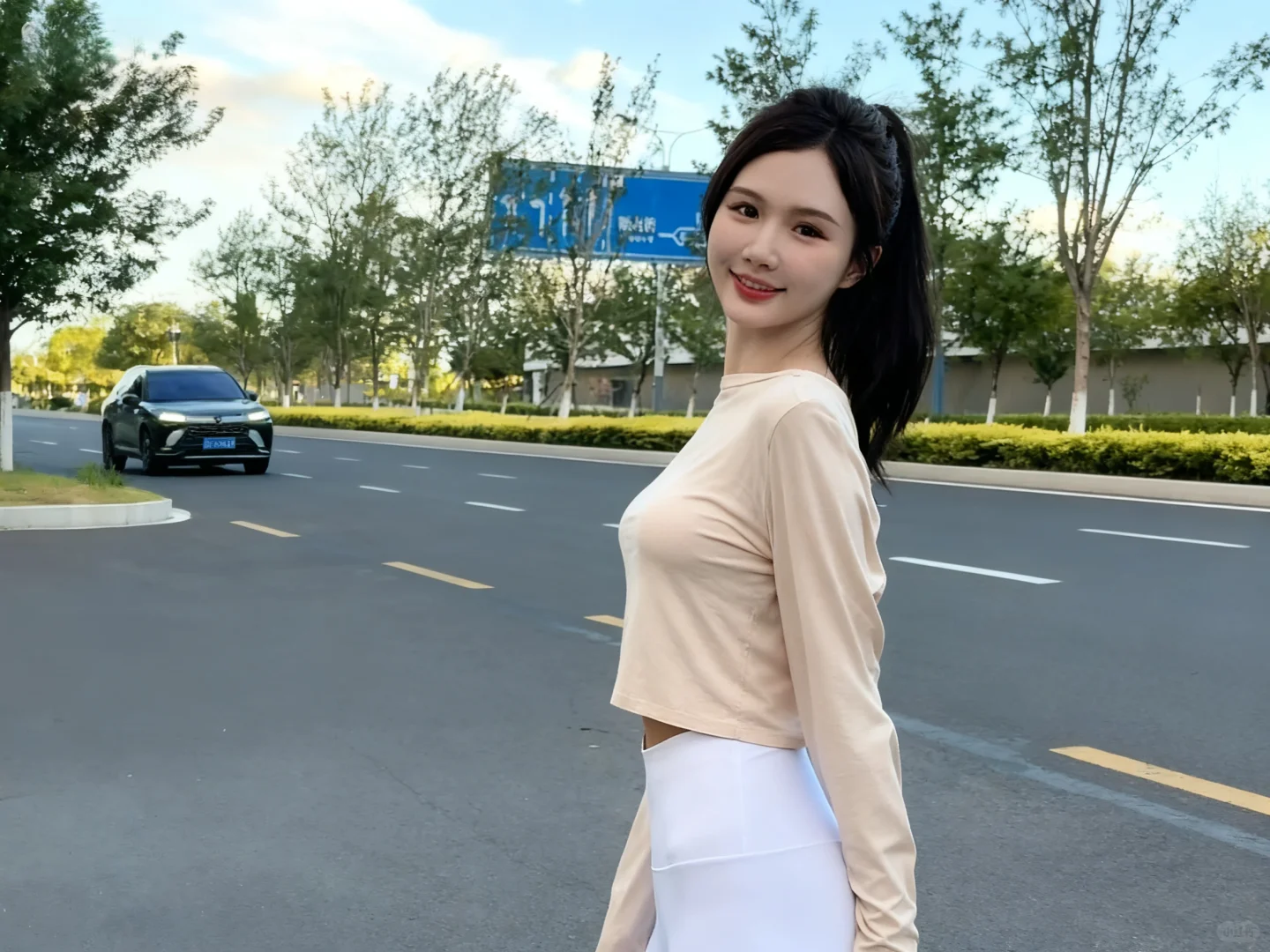 整体搭配以柔和色调为主,通过“浅米色+白色”的低饱和色系碰撞,营造清新雅致的视觉效果;简约剪裁与紧身版型的组合,既凸显身材优势,又传递出随性自在的生活态度,适配日常通勤、休闲出行等场景,尽显都市女性的活力与精致。