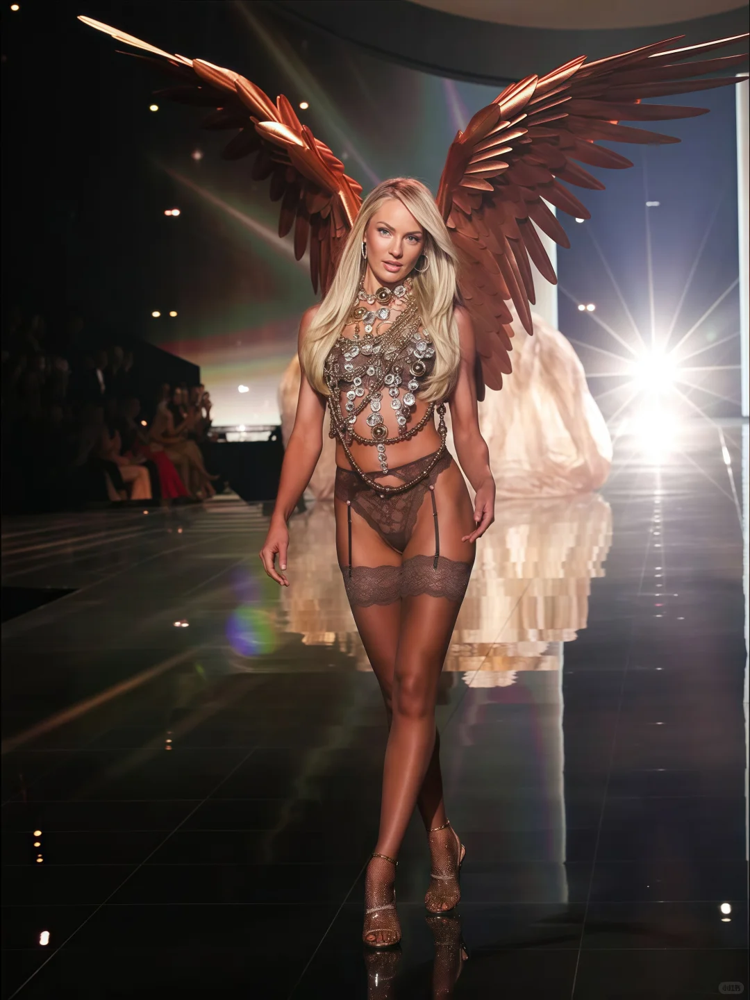金色流光造型将她标志性的身材展现得淋漓尽致。无数宝石随步摇曳,每一步都闪耀着“美神降临”的光芒,仿佛将观众带回了维密的黄金时代。