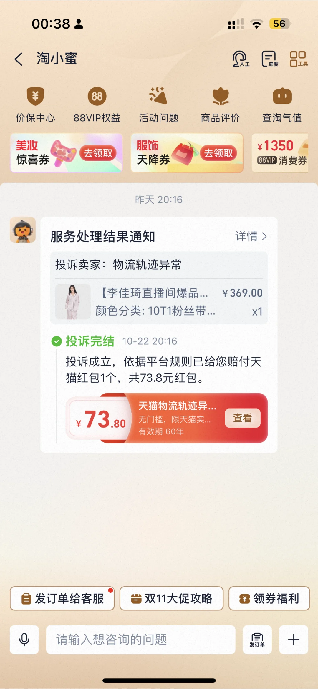 果断找88vip客服投诉 目前还不知道什么时候补发睡衣 但是红包已消气