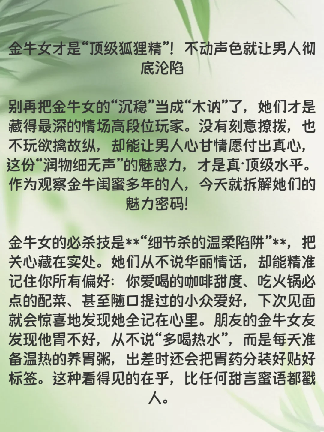 金牛女的必杀技是**“细节杀的温柔陷阱”**,把关心藏在实处。她们从不说华丽情话,却能精准记住你所有偏好:你爱喝的咖啡甜度、吃火锅必点的配菜、甚至随口提过的小众爱好,下次见面就会惊喜地发现她全记在心里。朋友的金牛女友发现他胃不好,从不说“多喝热水”,而是每天准备温热的养胃粥,出差时还会把胃药分装好贴好标签。这种看得见的在乎,比任何甜言蜜语都戳人。