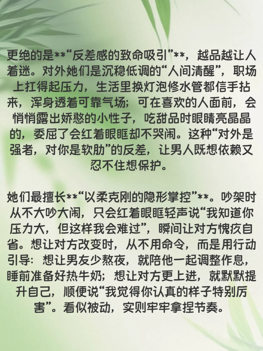 更绝的是**“反差感的致命吸引”**,越品越让人着迷。对外她们是沉稳低调的“人间清醒”,职场上扛得起压力,生活里换灯泡修水管都信手拈来,浑身透着可靠气场;可在喜欢的人面前,会悄悄露出娇憨的小性子,吃甜品时眼睛亮晶晶的,委屈了会红着眼眶却不哭闹。这种“对外是强者,对你是软肋”的反差,让男人既想依赖又忍不住想保护。