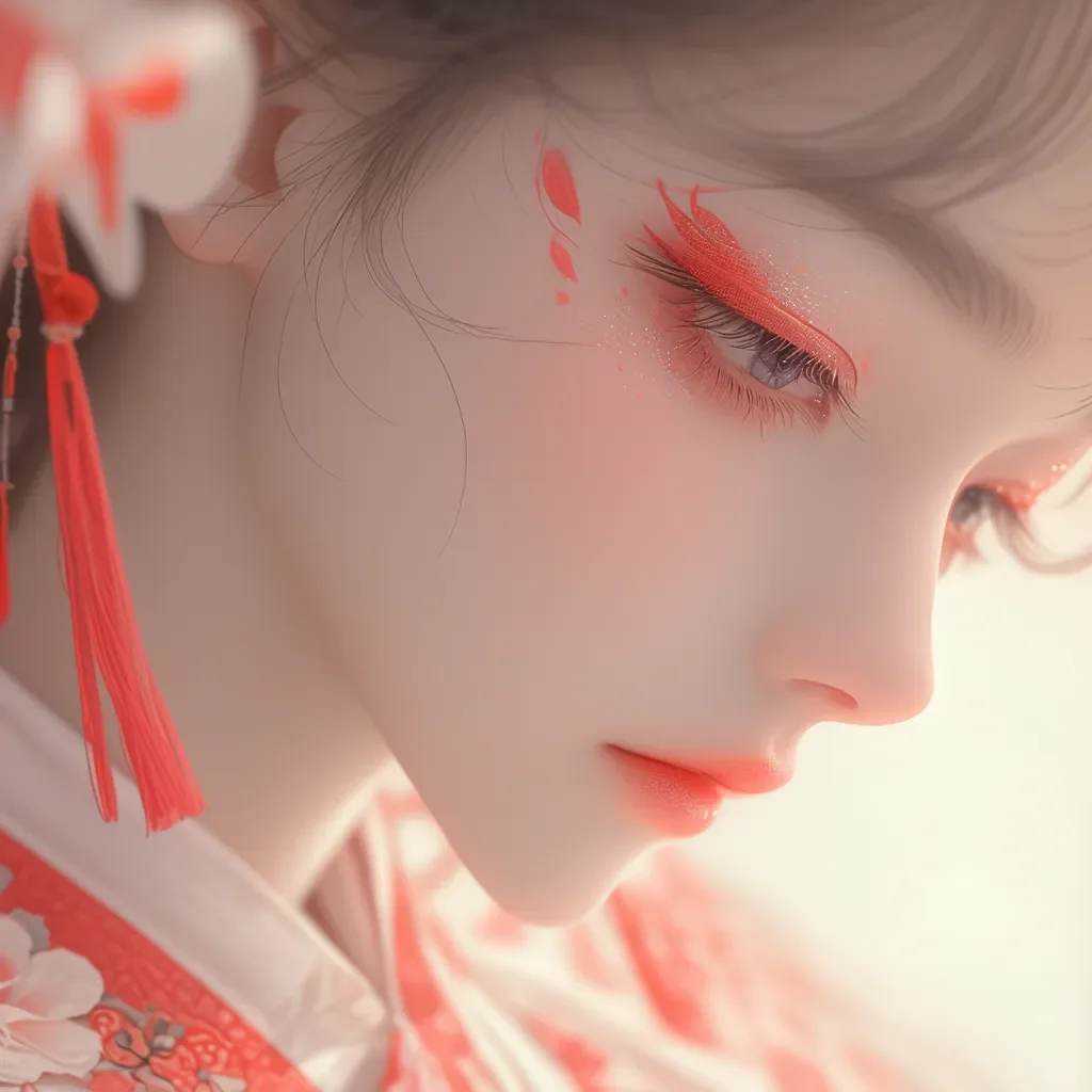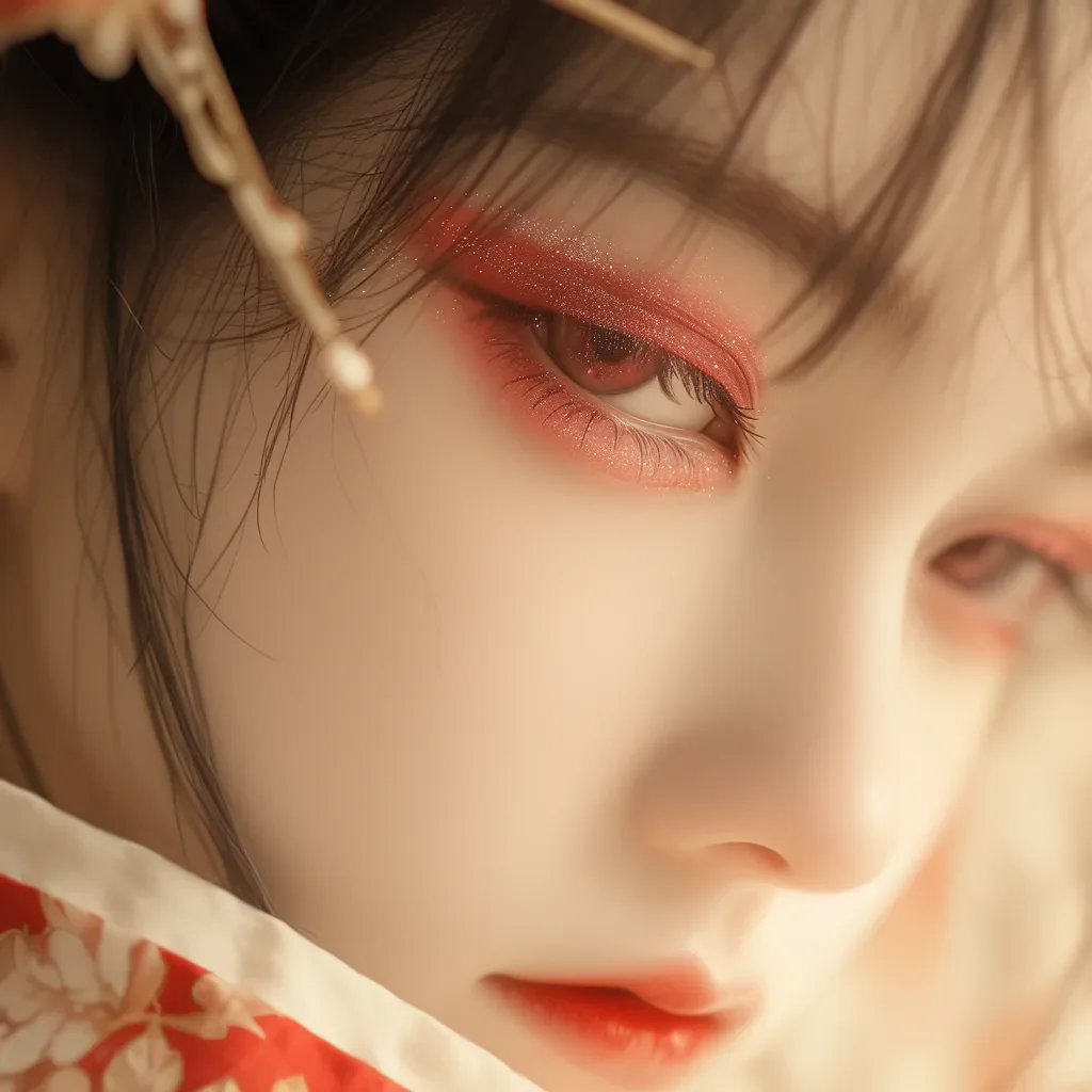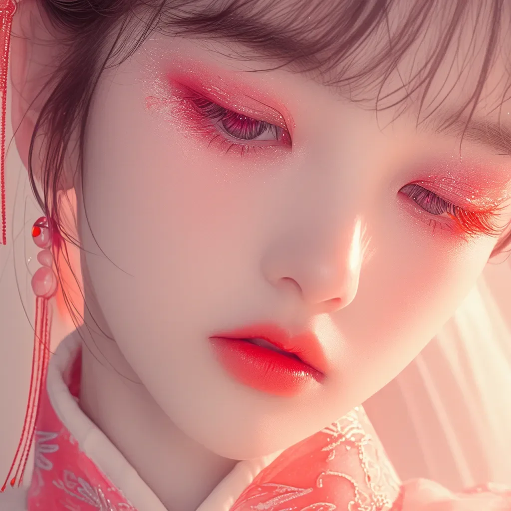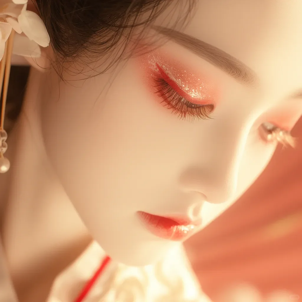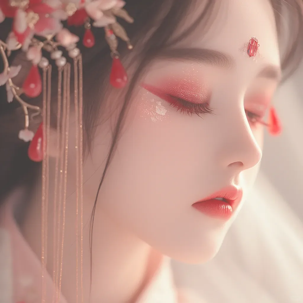 胭脂泪,相留醉。芙蓉如面柳如眉。海棠桃红晕宿雨。杏红衫子薄罗裳。