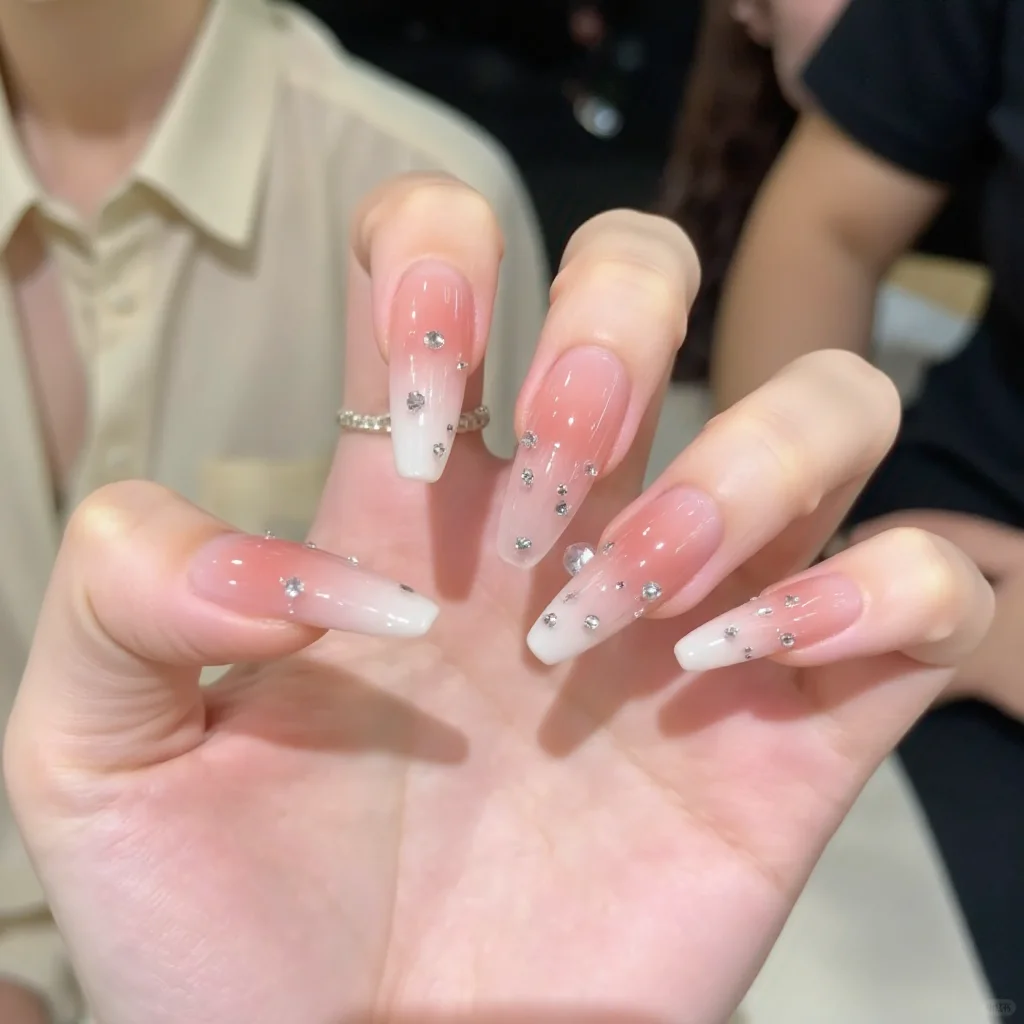 纯欲天花板!裸粉渐变长甲+碎钻点缀