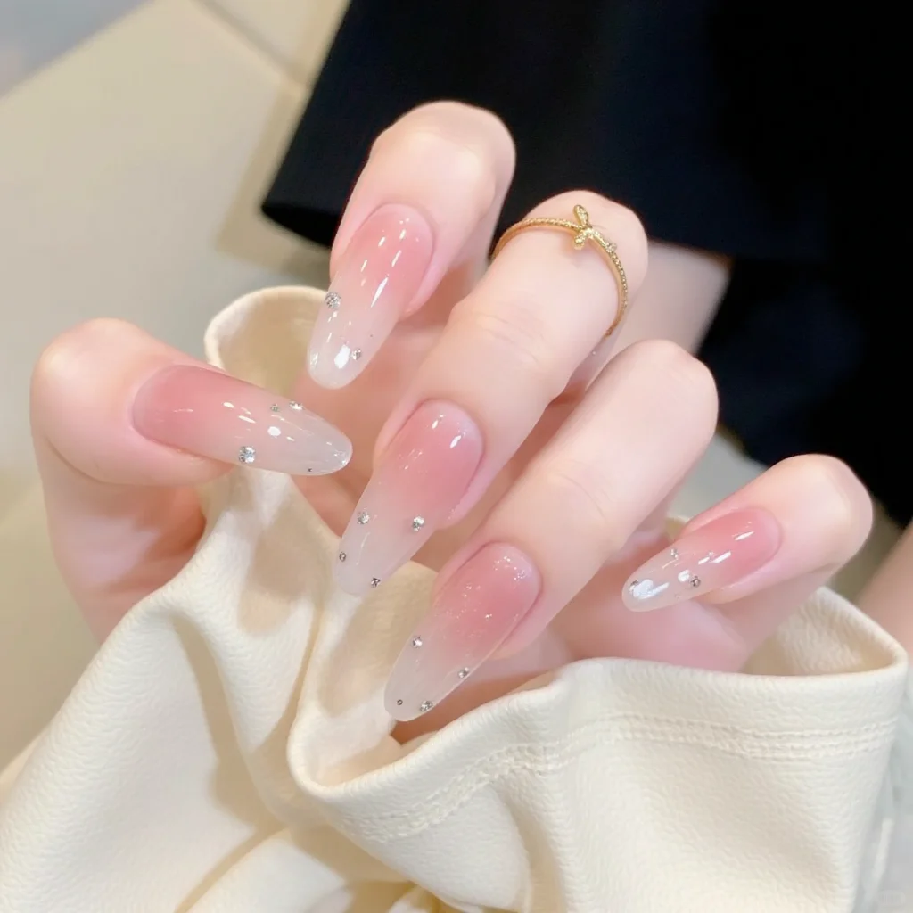 裸粉色渐变温柔到犯规,搭配长尖甲型,手直接拉长一个度!零星碎钻在光下闪到失语,又甜又欲的感觉谁懂啊~
