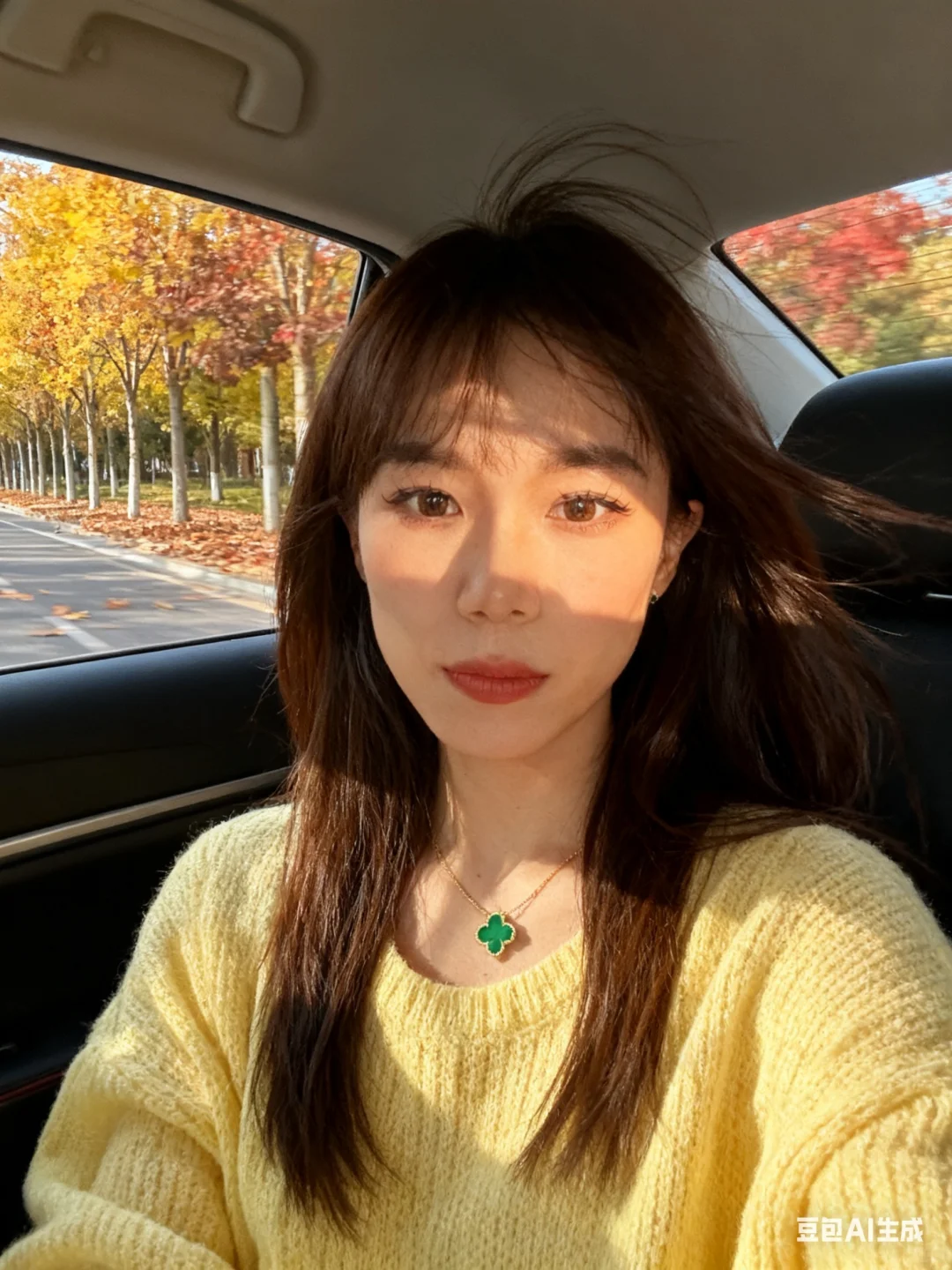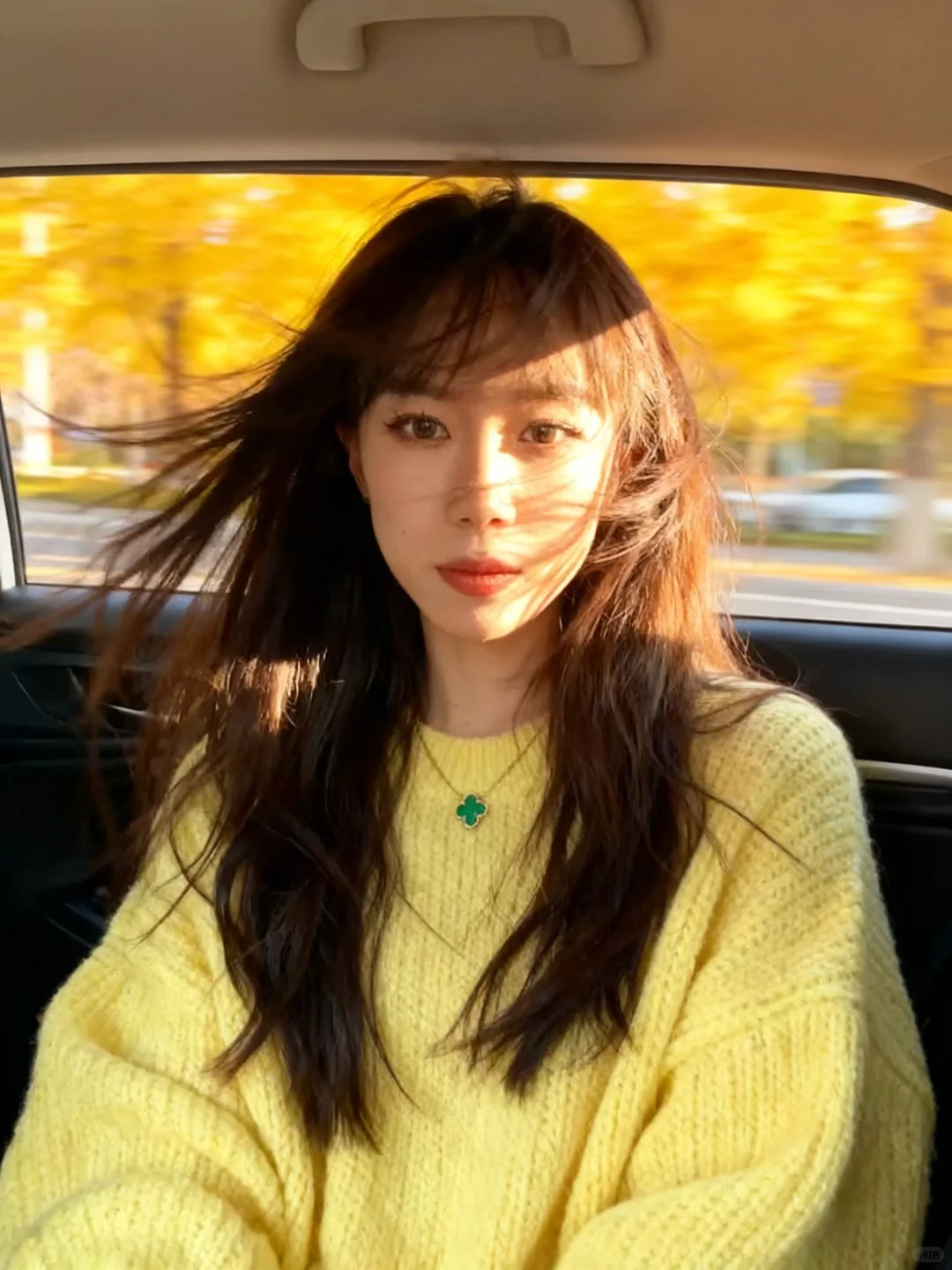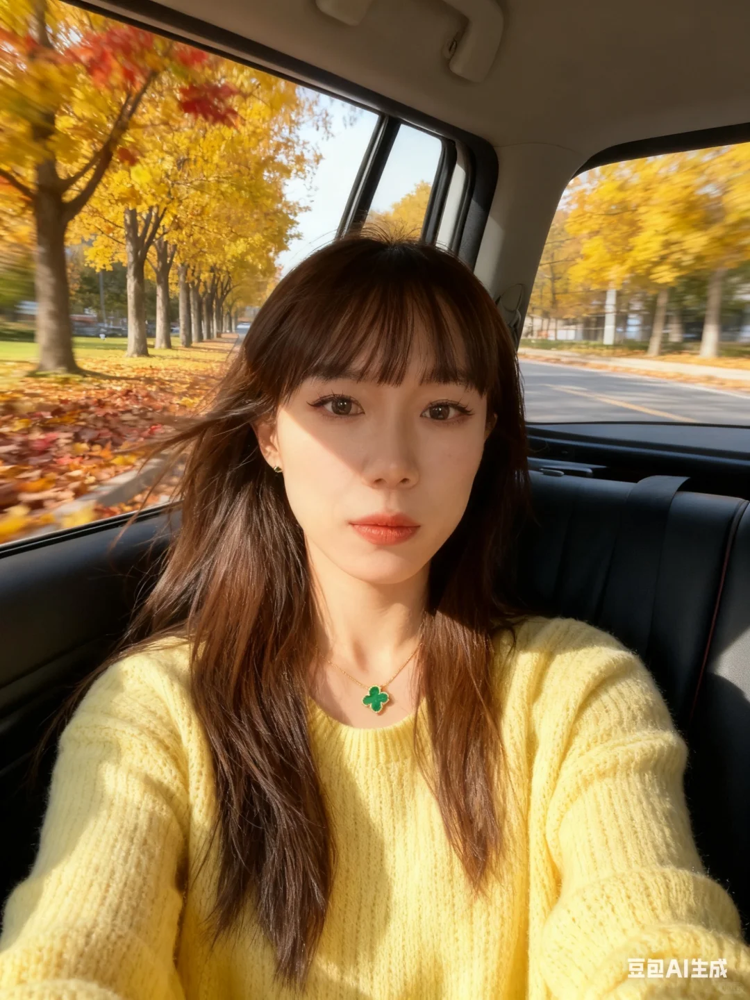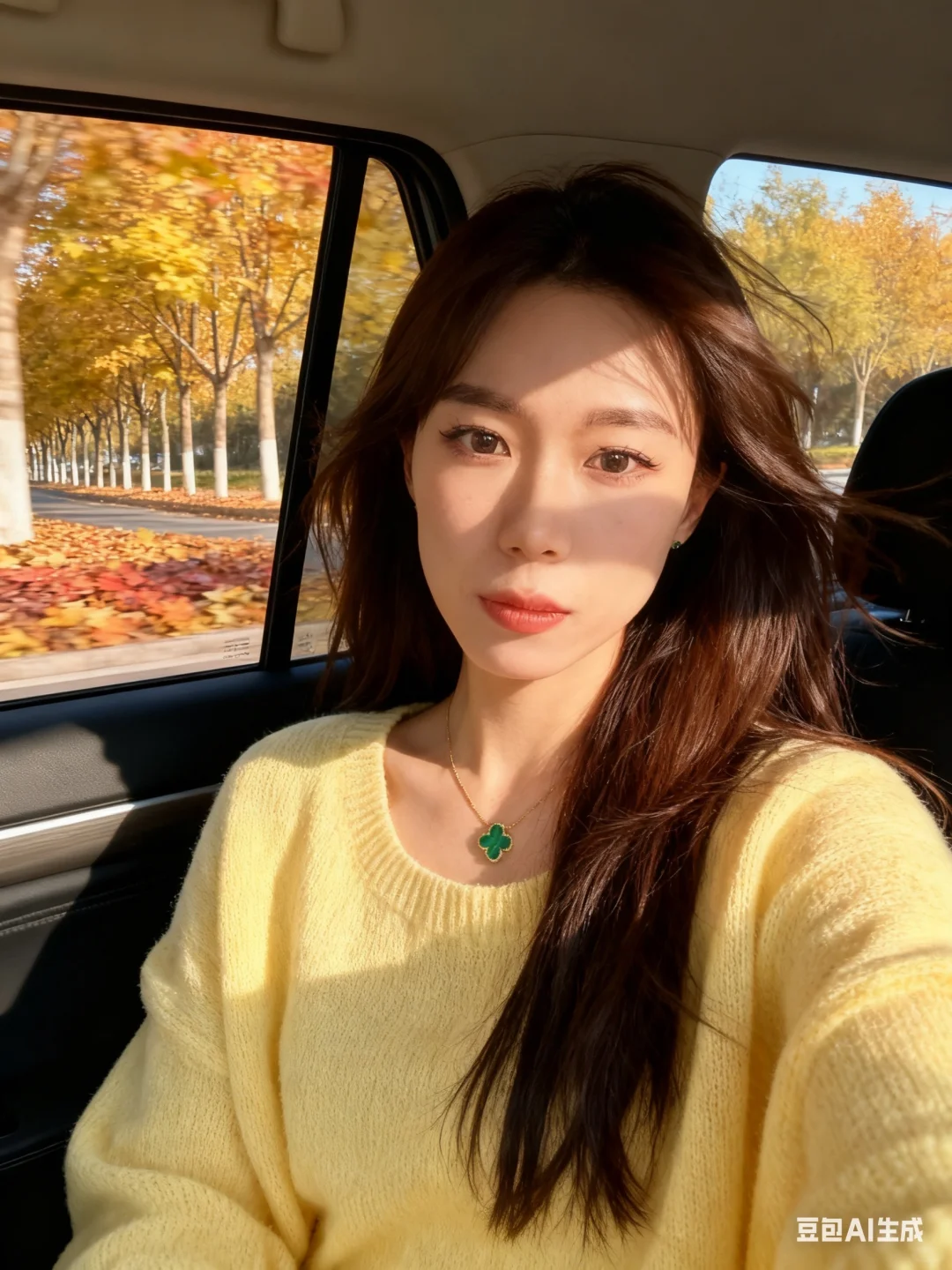 人物坐在行驶的轿车中,车窗外是秋天街景,并排的树木,满地落叶,叶子是黄色、红色或者是棕色。车内人物坐在轿车后排,正面对镜头,身后是侧面玻璃车窗,周围环境符合真实4座轿车内饰和结构,深色内饰。镜头聚焦人物,车窗外景色高速移动模糊。人物保持原照片面部特征,皮肤通透细腻。头发保持原照片特征,发色偏棕,自然吹动。有温色阳光从侧面照在脸颊,半边脸被照亮,光影交错,自然阴影。人物身穿鹅黄色针织毛衣,衣服宽松慵懒。原比例。