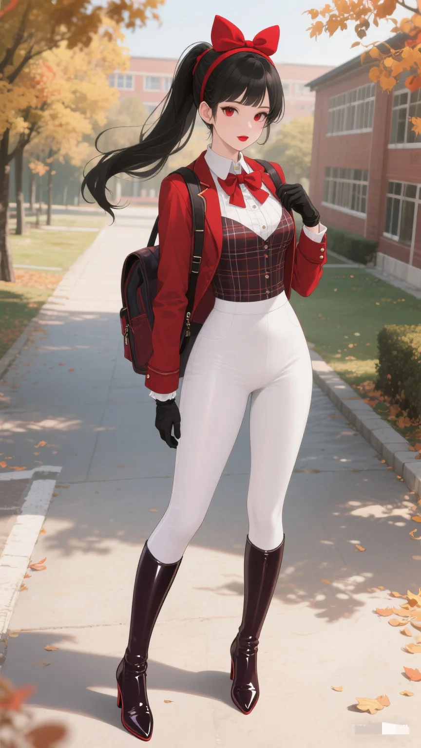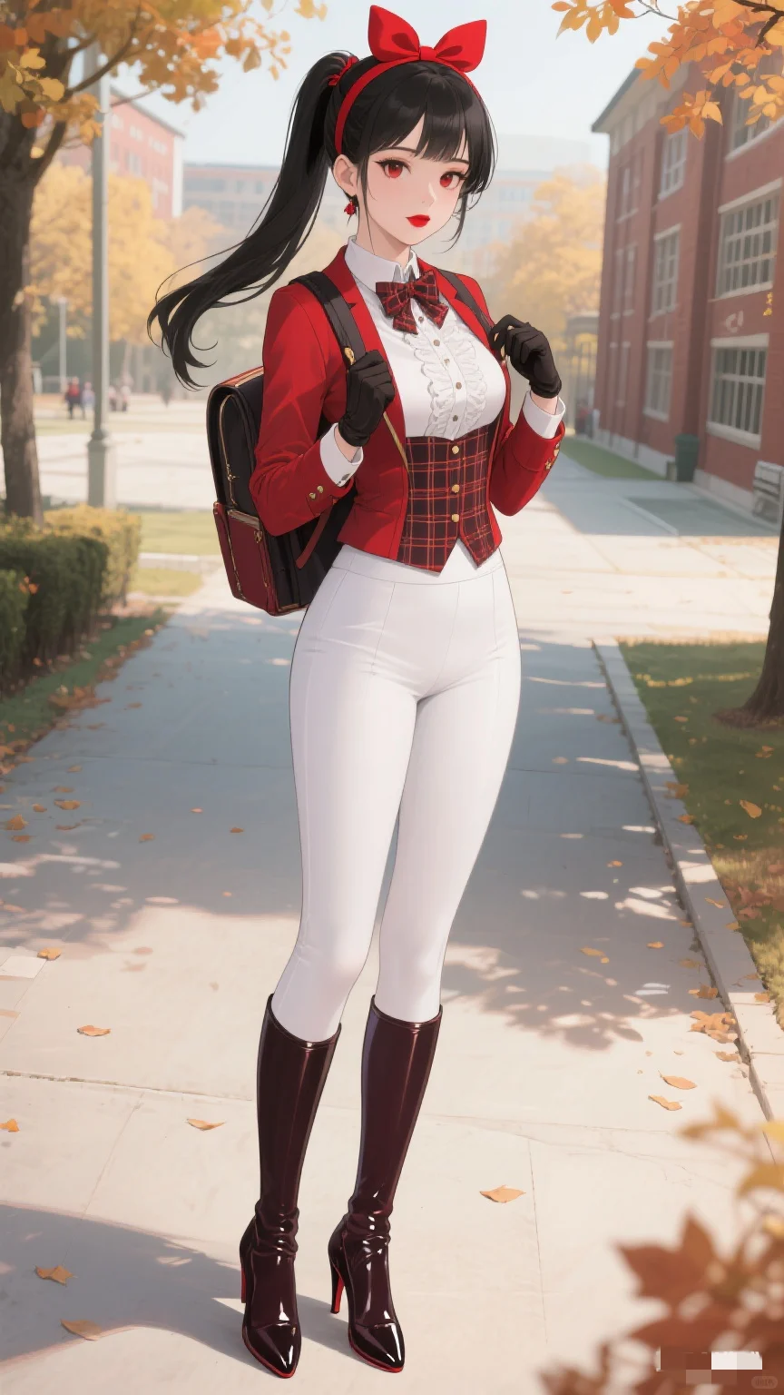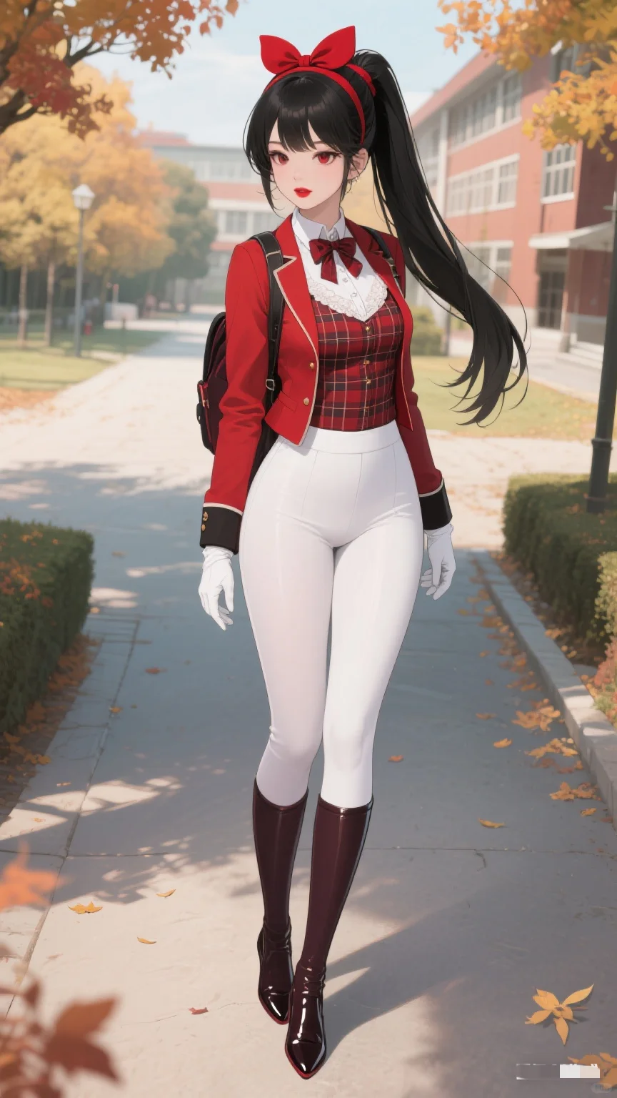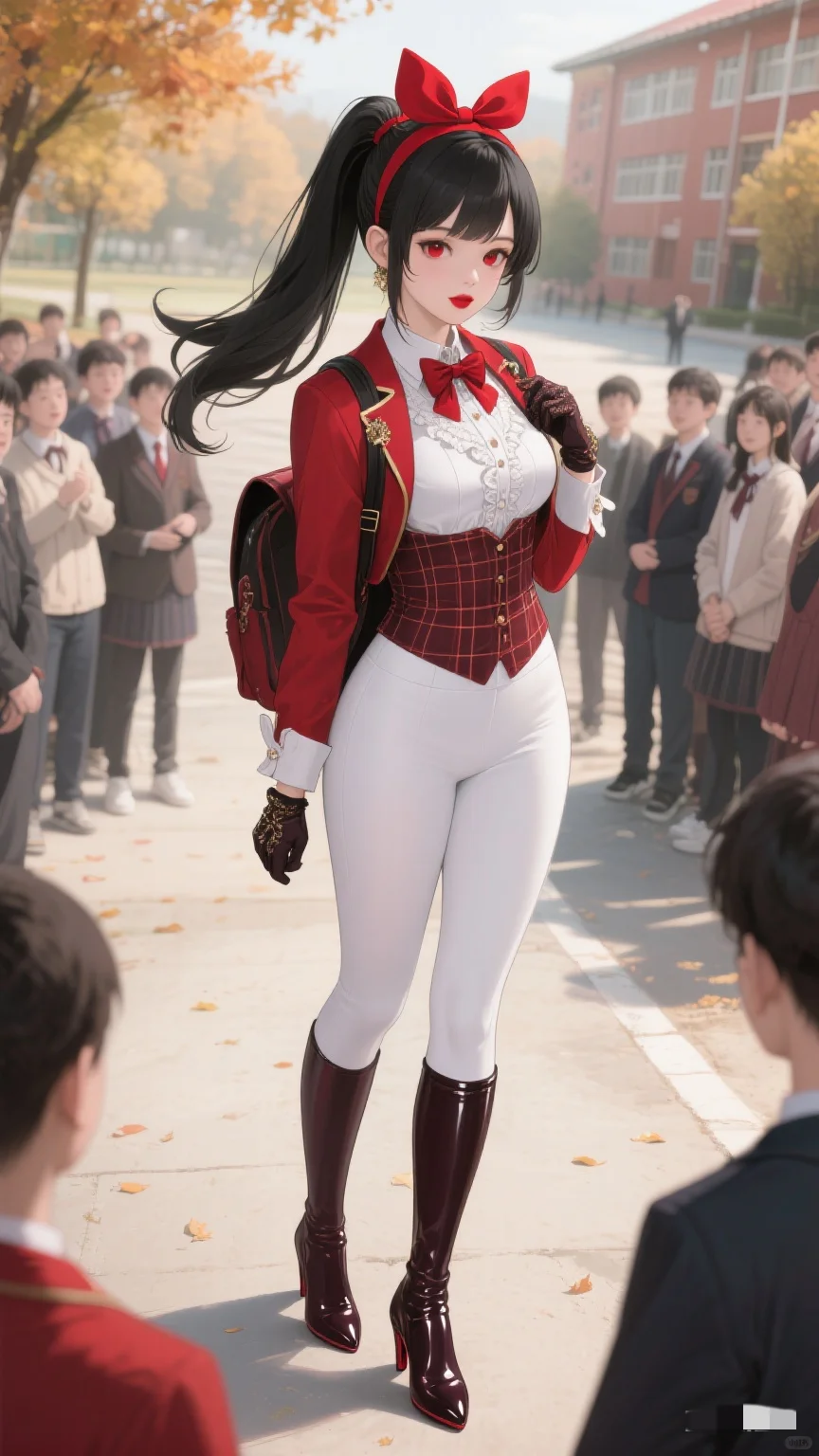 红与白的时尚碰撞,秋日校园的亮眼存在。
