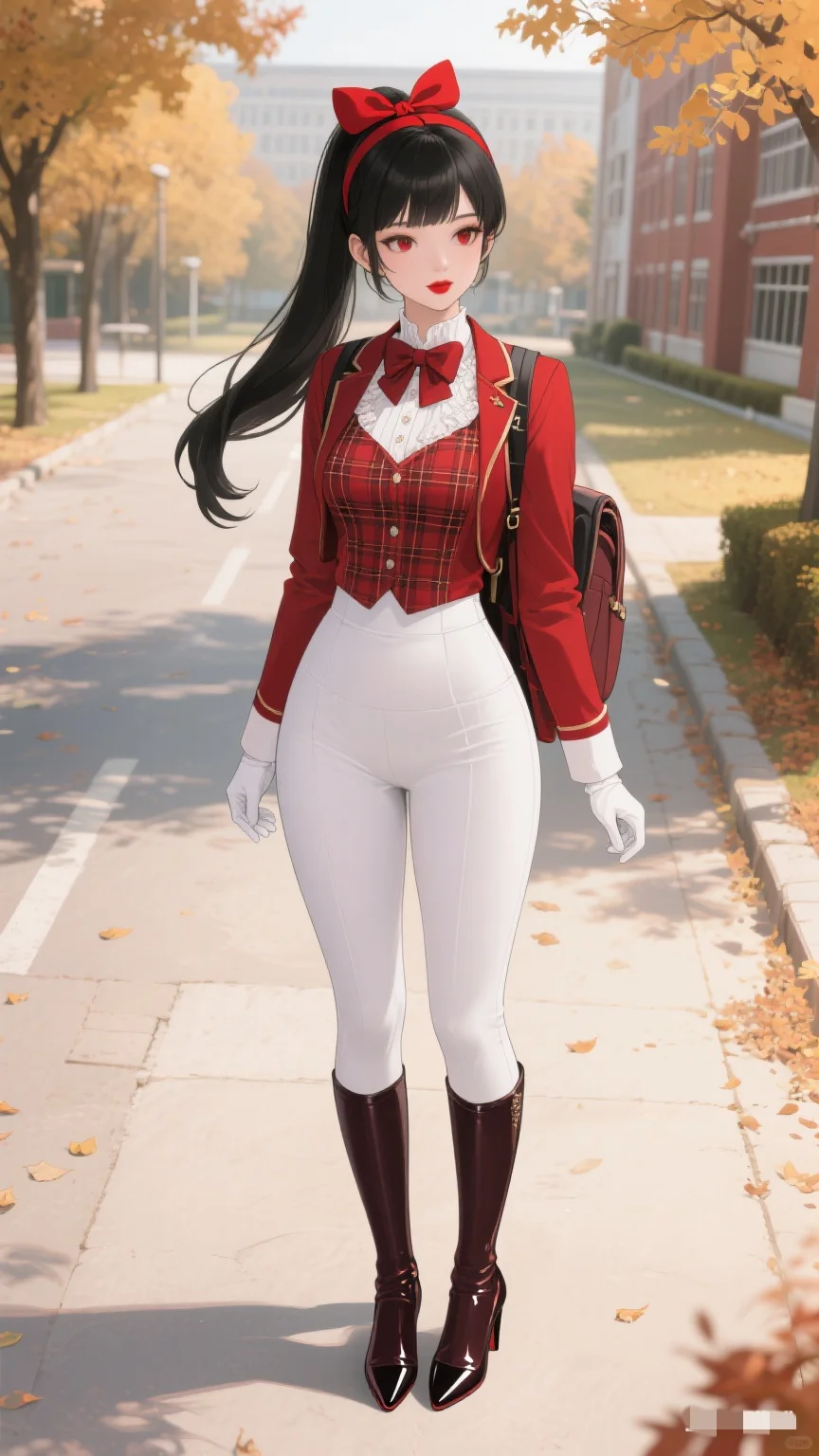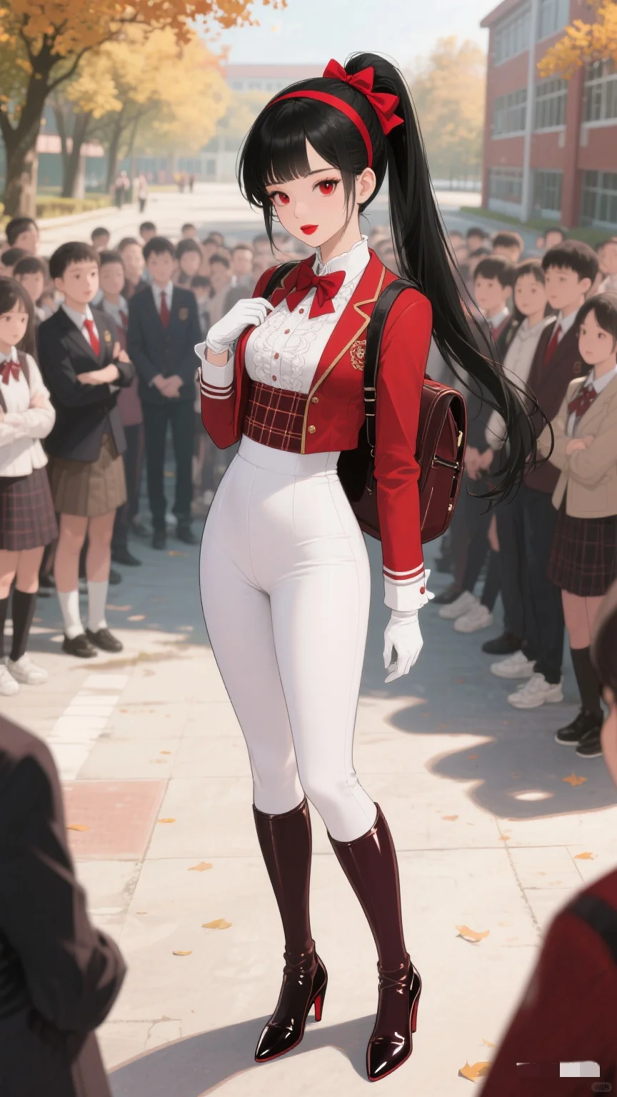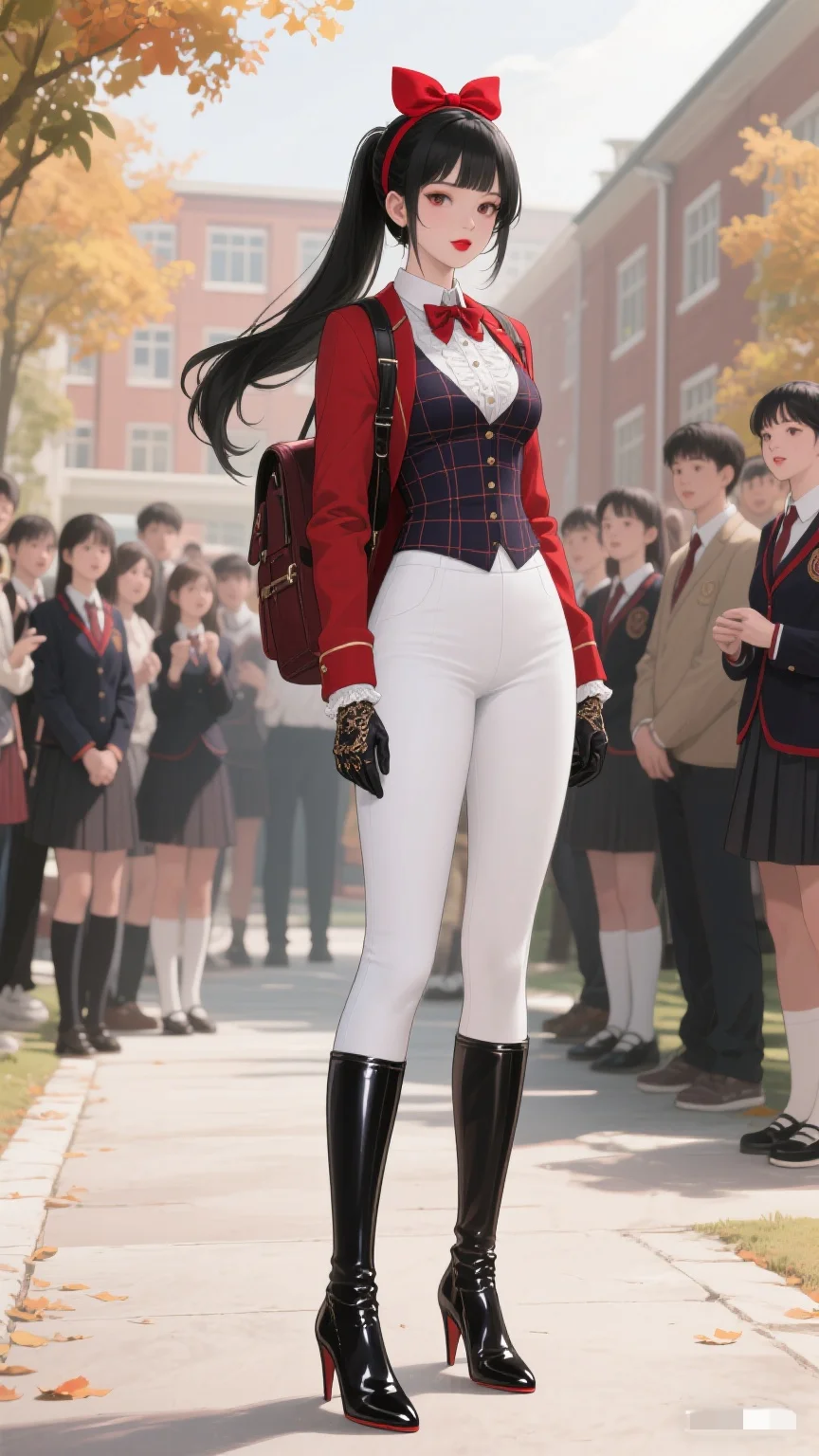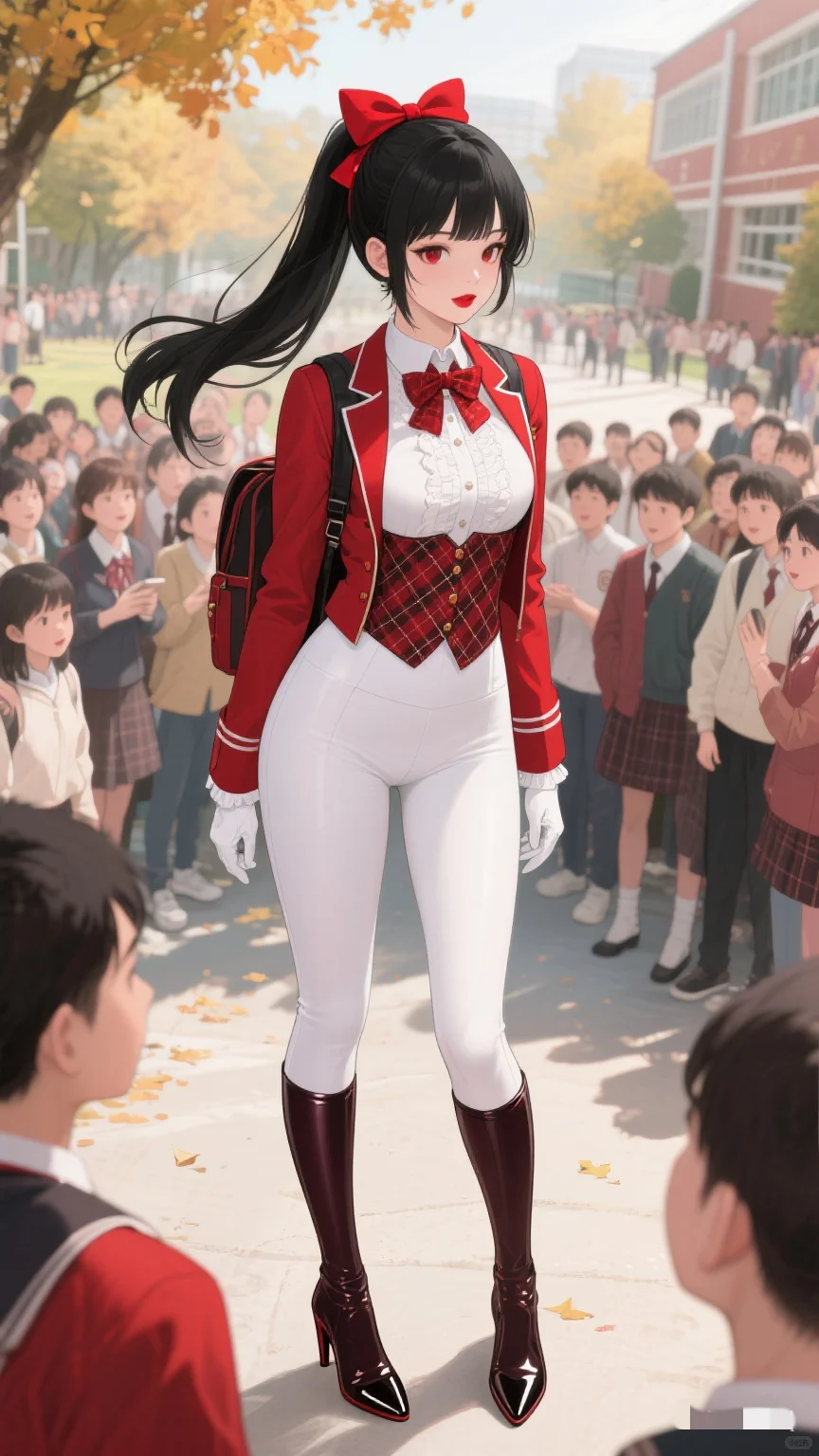 红与白的时尚碰撞,秋日校园的亮眼存在。