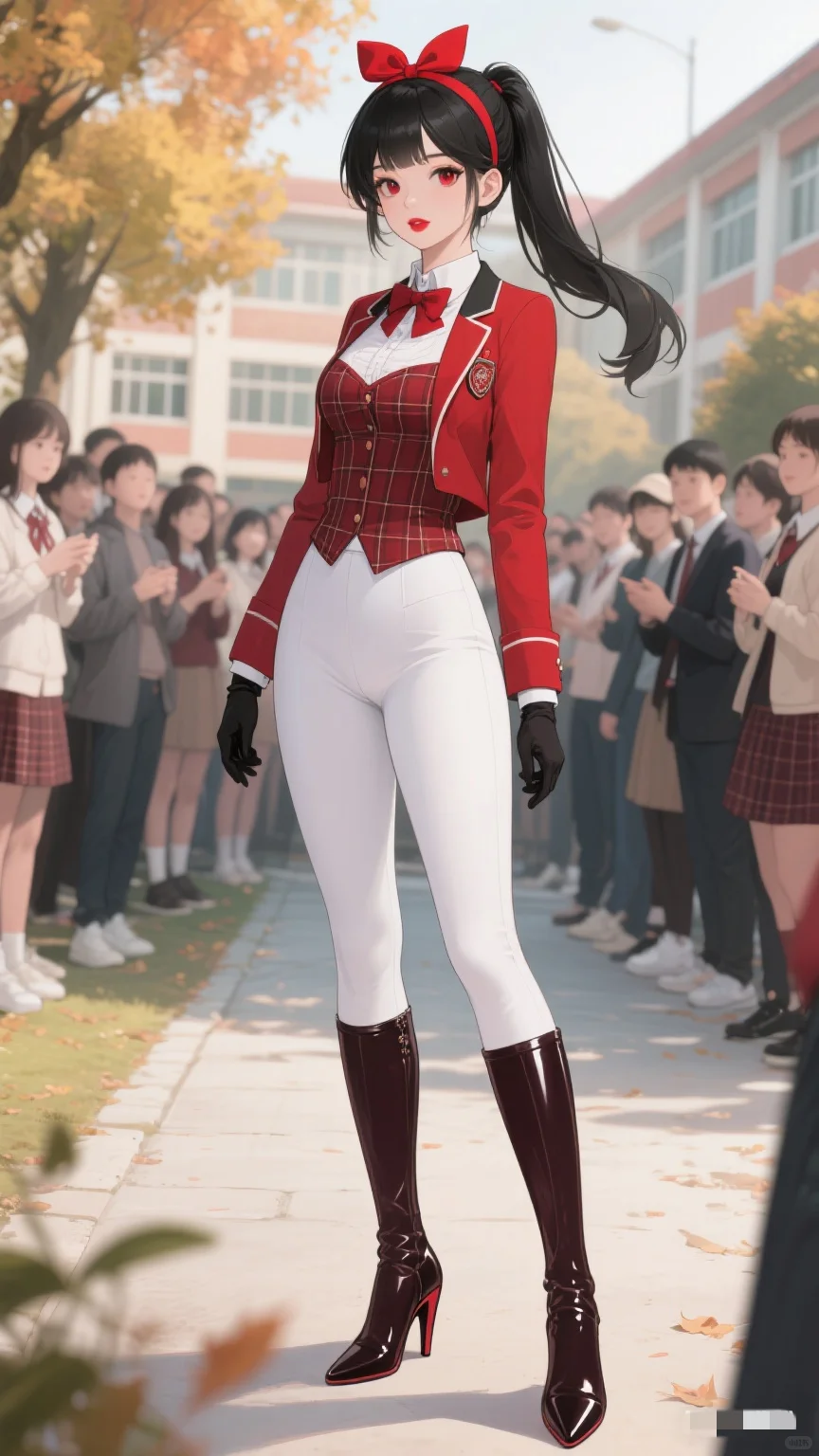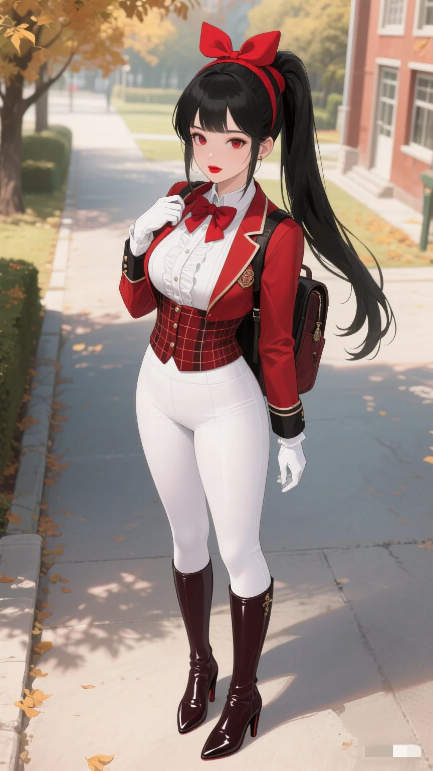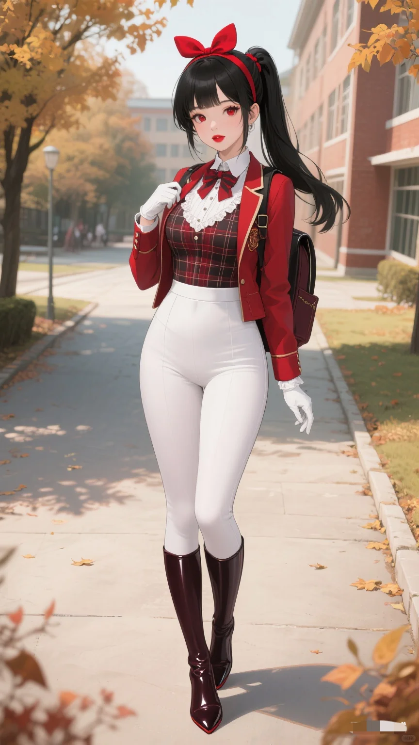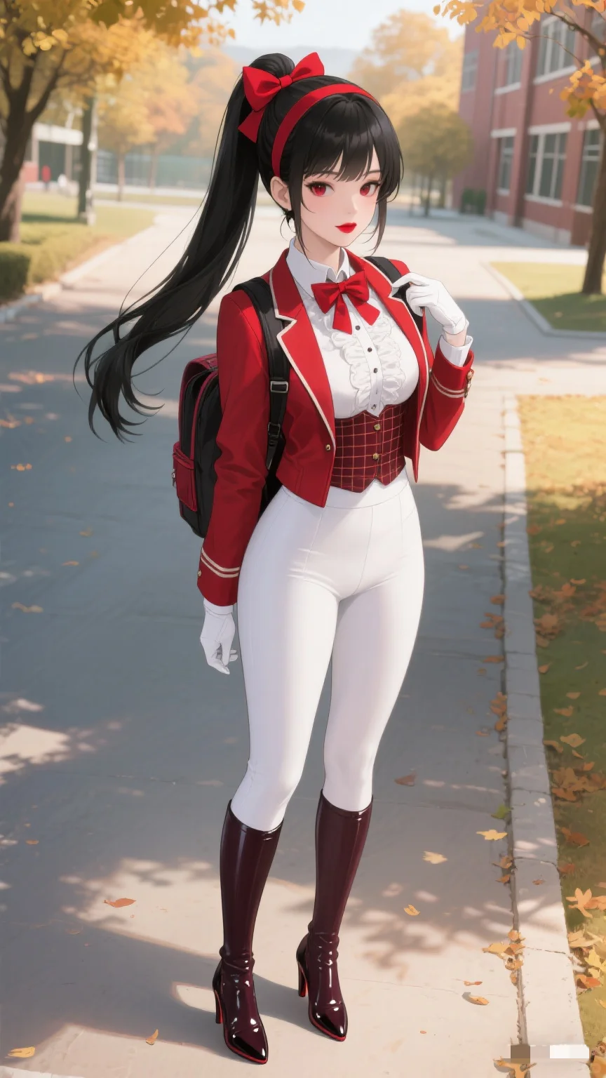 红与白的时尚碰撞,秋日校园的亮眼存在。