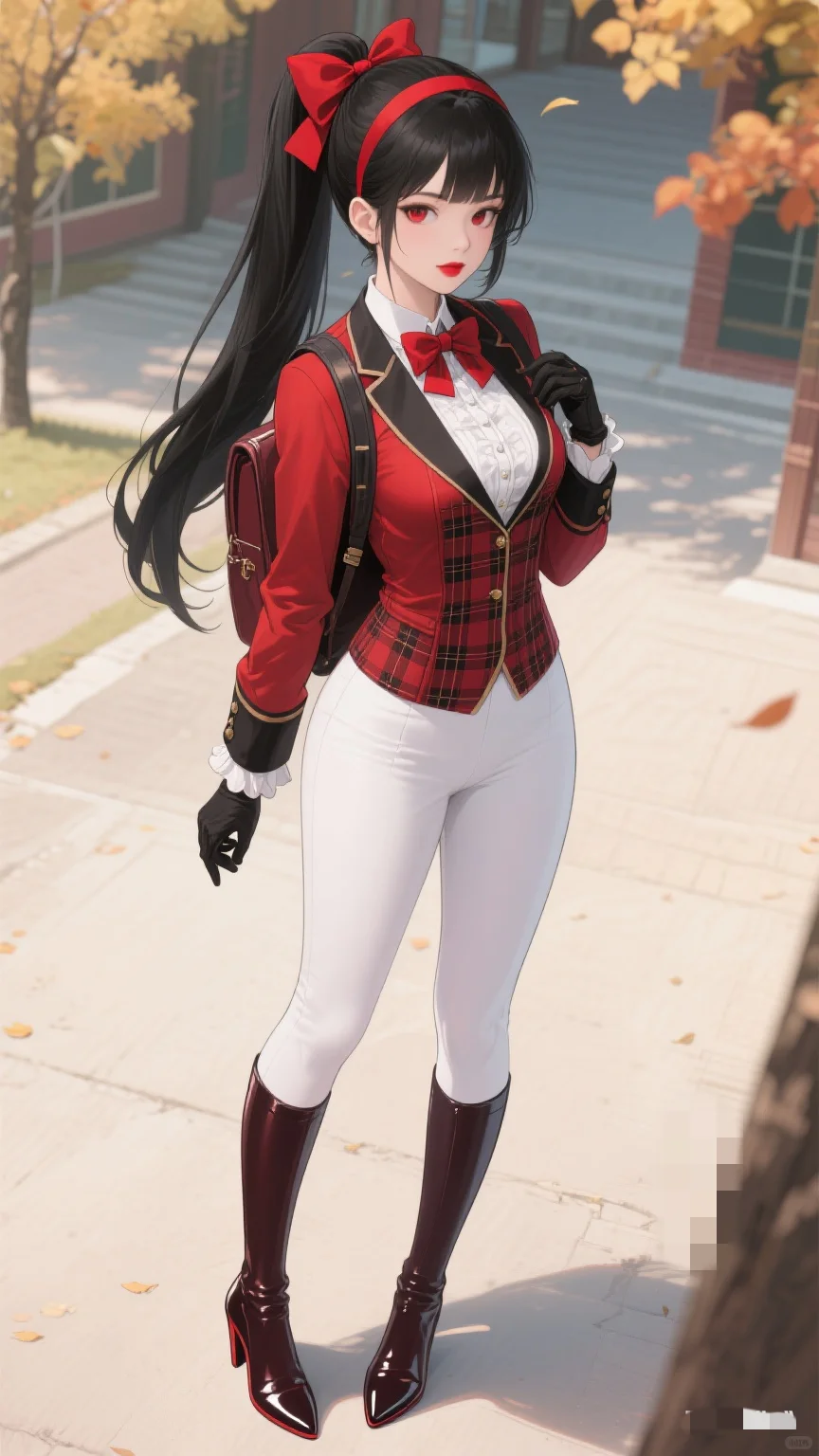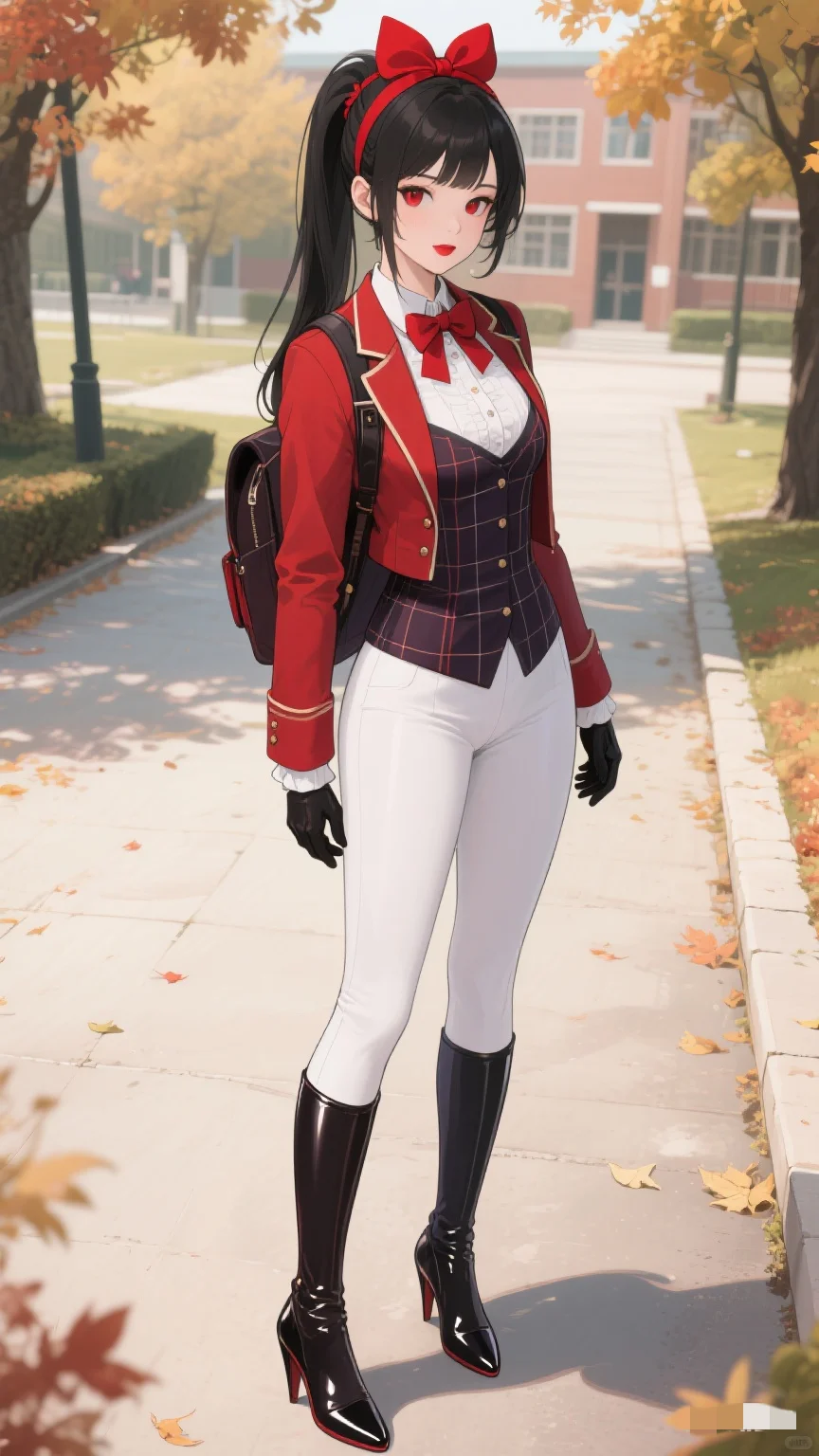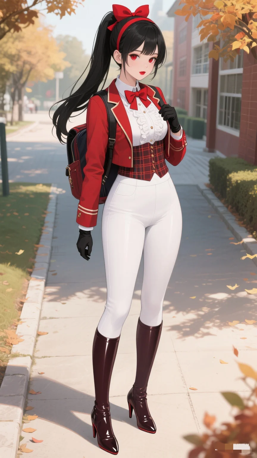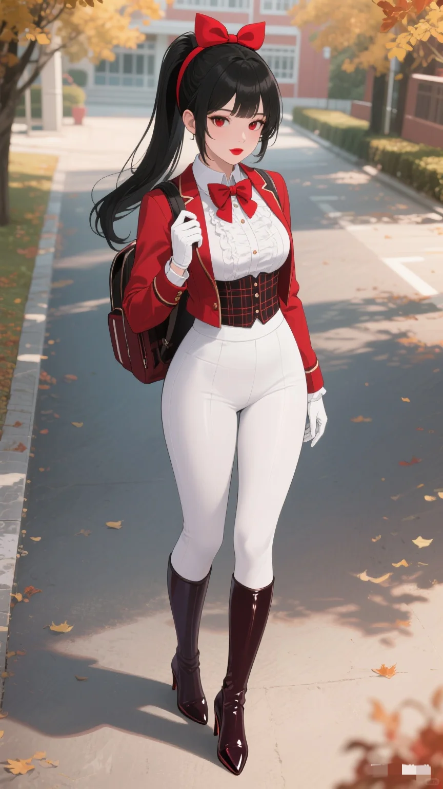 红与白的时尚碰撞,秋日校园的亮眼存在。