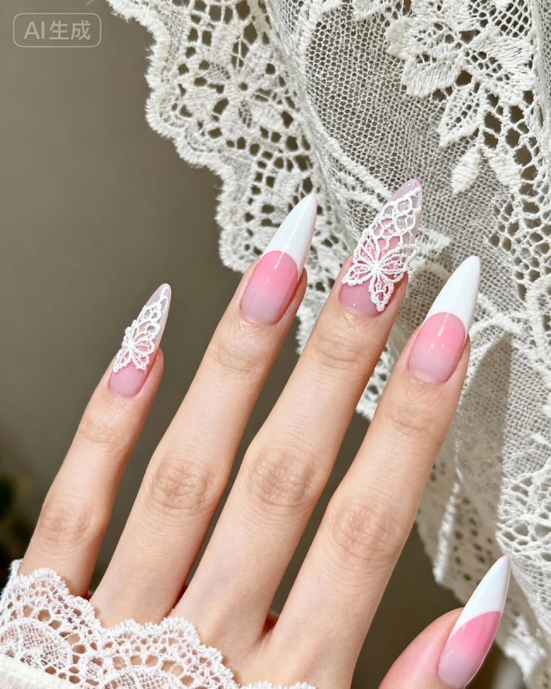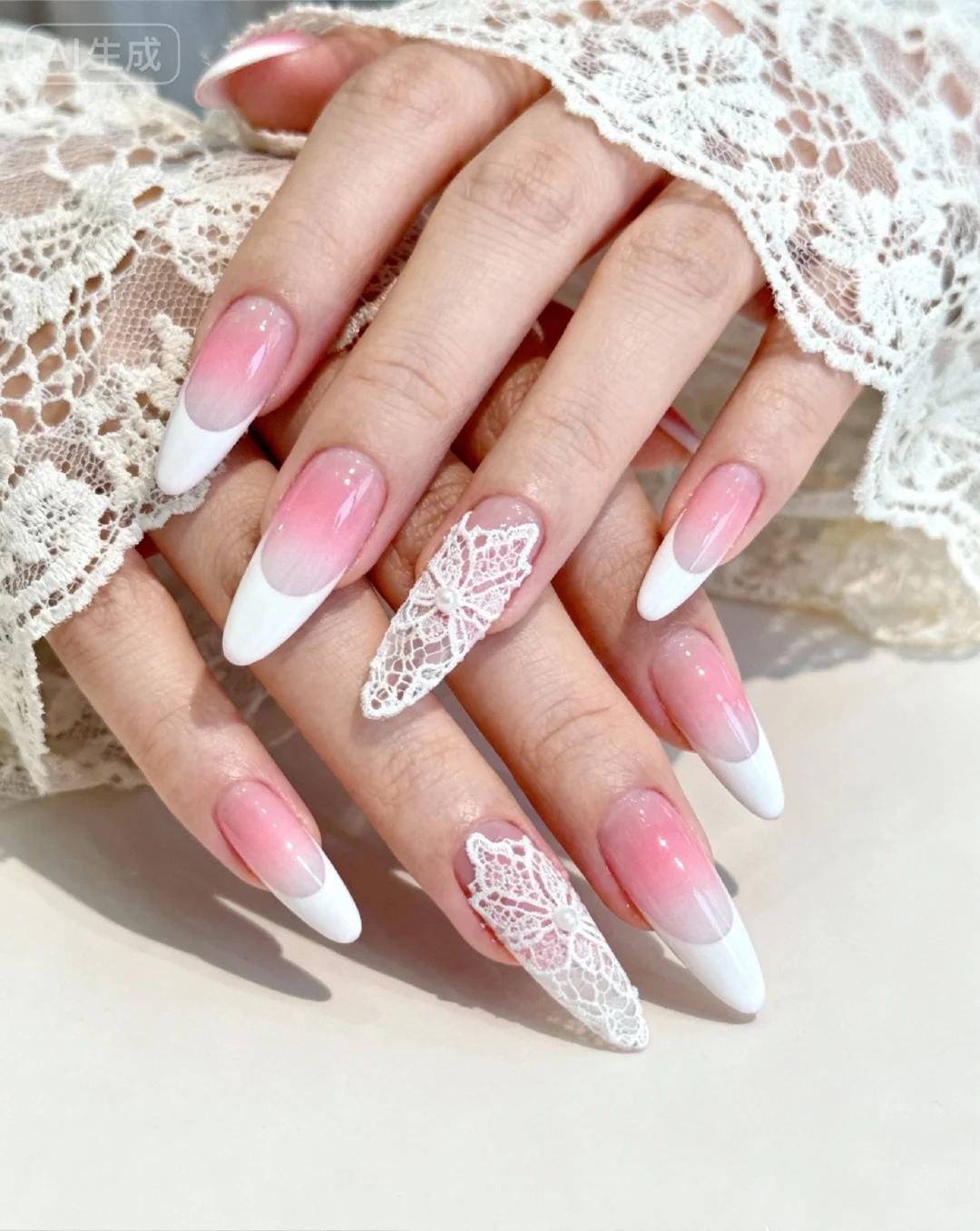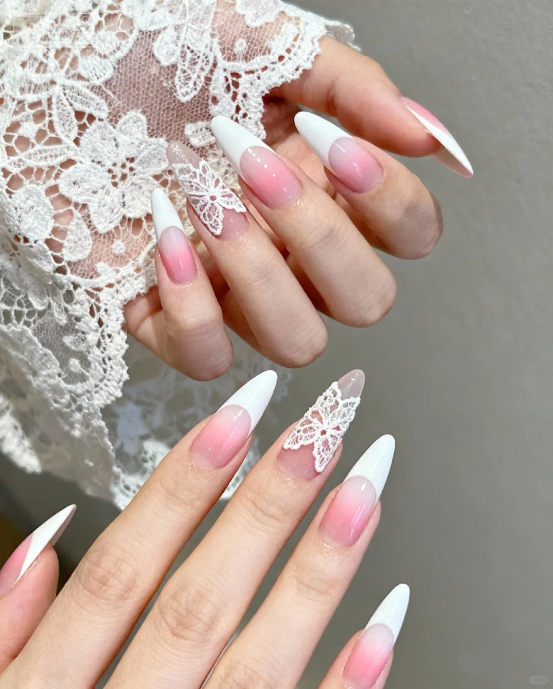 把蕾丝裙焊在指甲上了!这粉白渐变直接嫩成