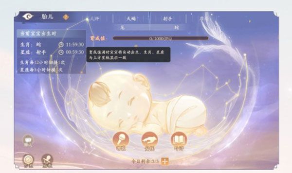 2、育儿阶段,结谊双方可通过唱歌、安抚、吟诗来呵护胎儿的成长,需要注意的是,使用不同的呵护方式会影响孩子长大后的标签,当育成值满之后就能迎接你们的宝啦。